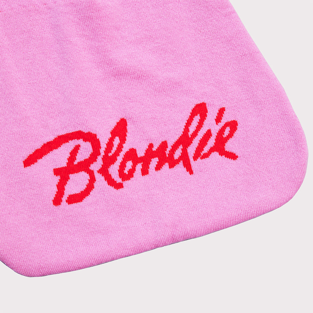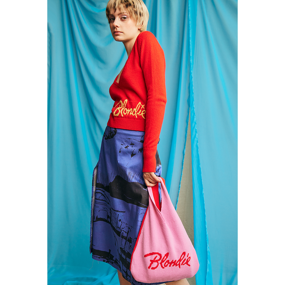 Handcrafted in England from 100% lambswool. The bag has the slogan "Call Me" on the front and 'Blondie' on the back.