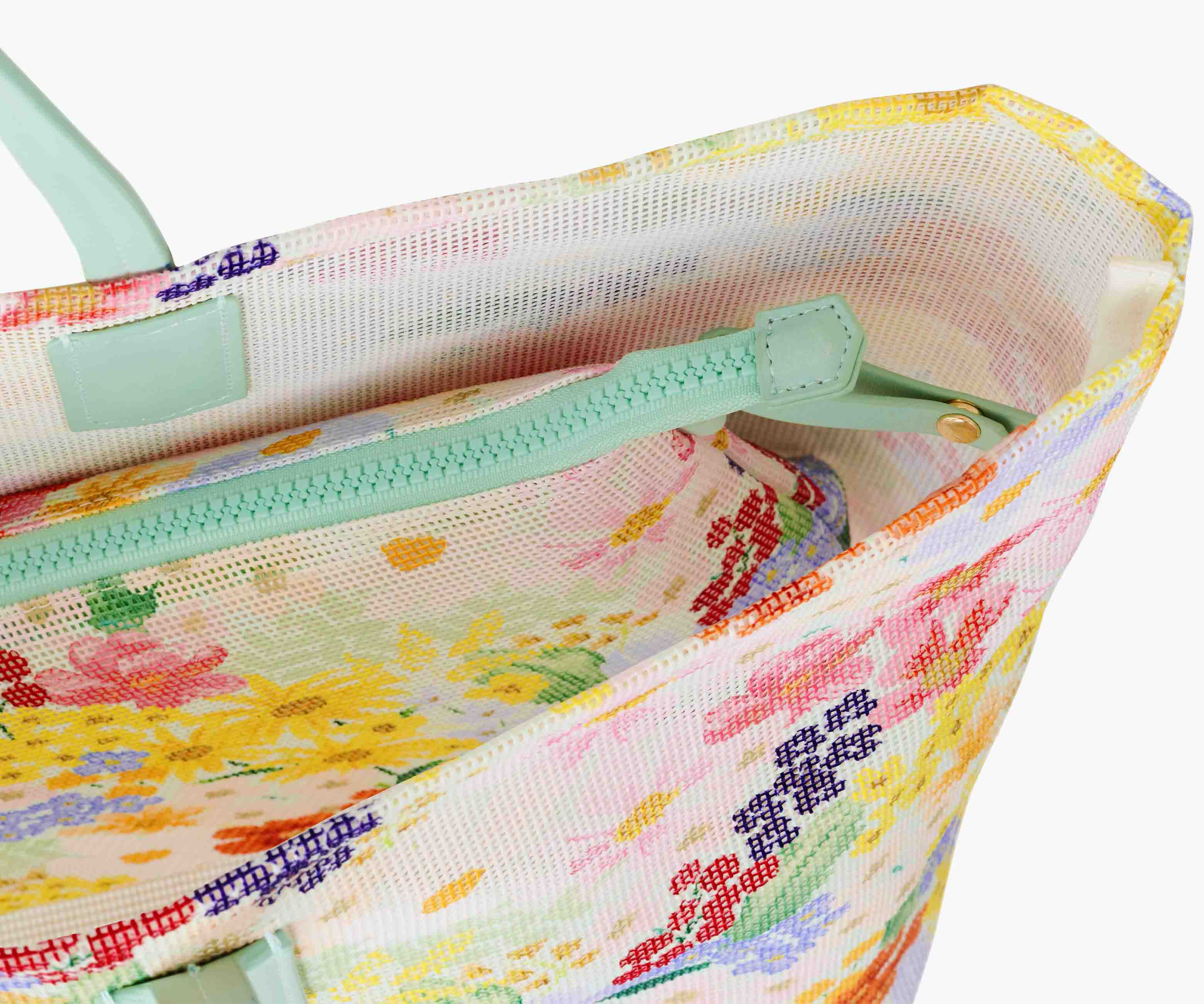 From beach trips to pool days, our mesh totes are the companion to all your summer adventures. The mesh material features our cheerful Margaux print and lets the sand filter out. A matching zipper pouch is included, and can be attached to the interior with a snap closure.