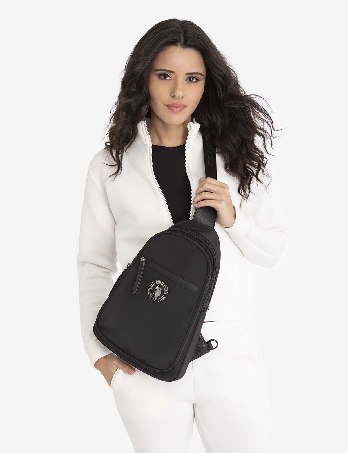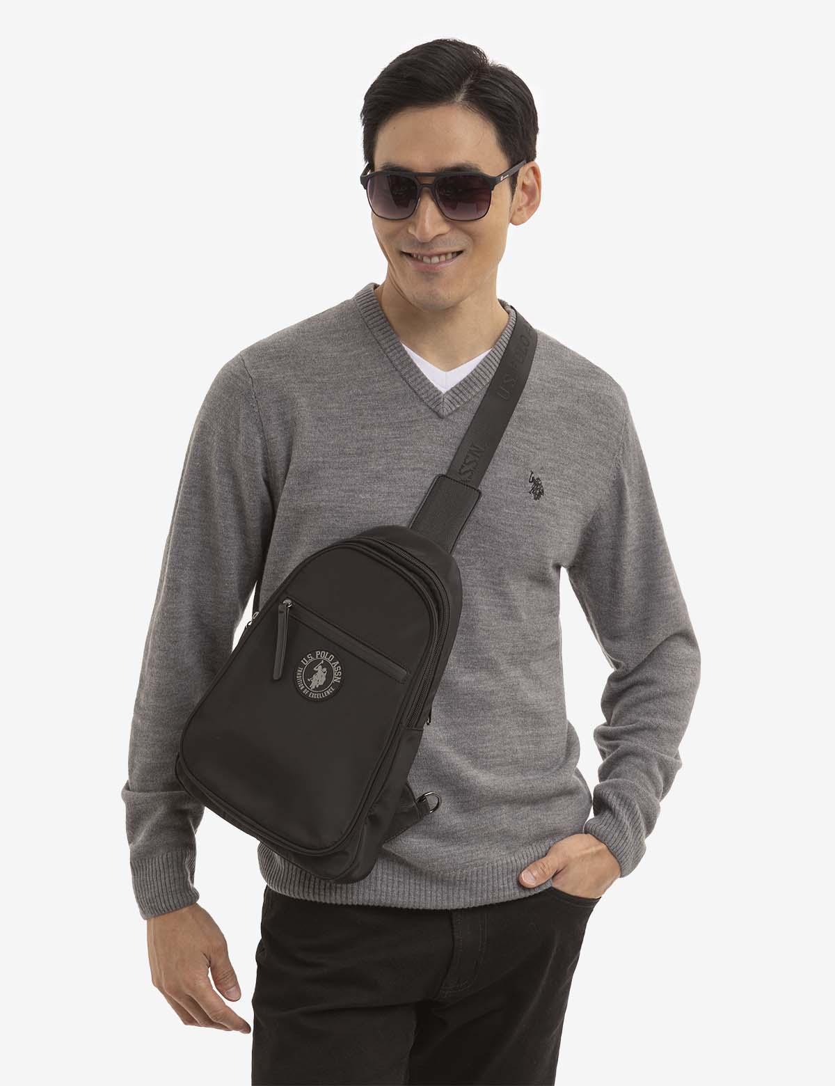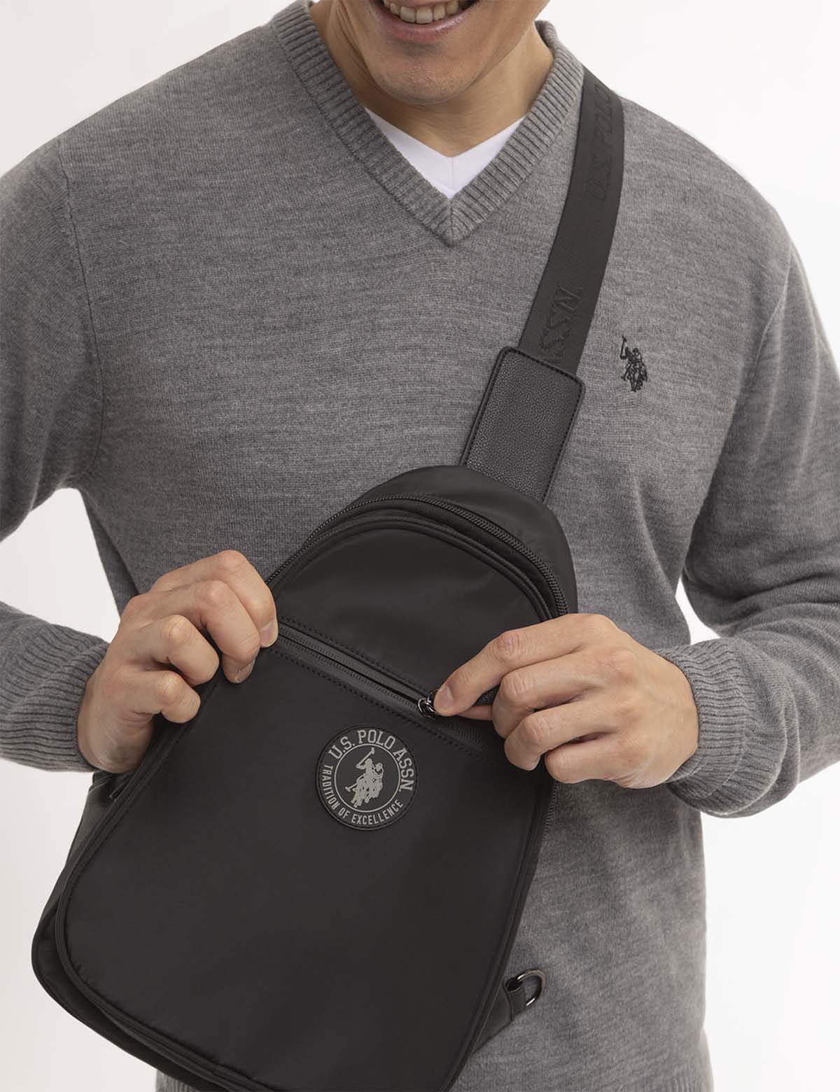 Crafted from 100% Nylon, this stylish sling backpack features a rubber U.S. Polo Assn. branded patch at center front along with an exterior pocket for quick access. Equipped with a double zip entry, the main backpack compartment includes credit card slots for an extra element of convenience. The webbed strap allows for twin-direction wearability – on the front or the back.