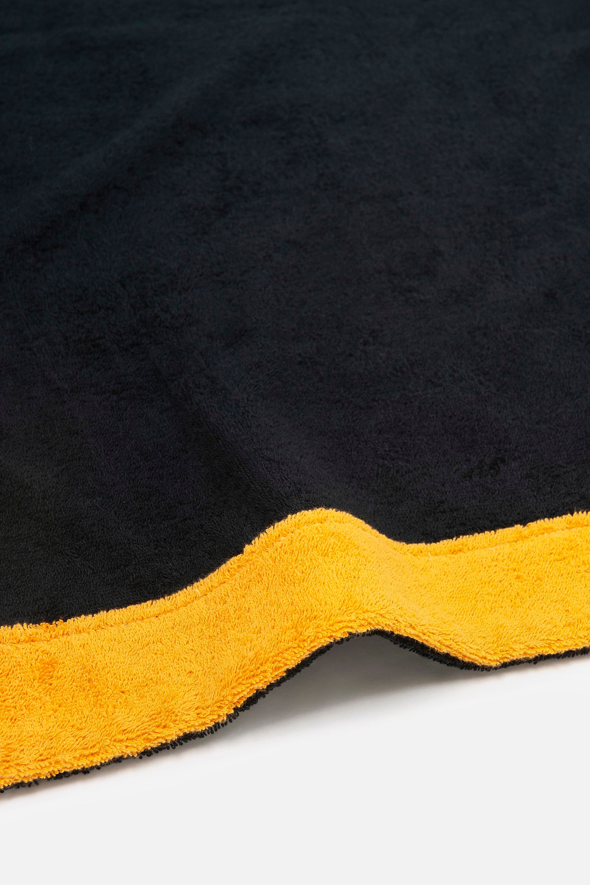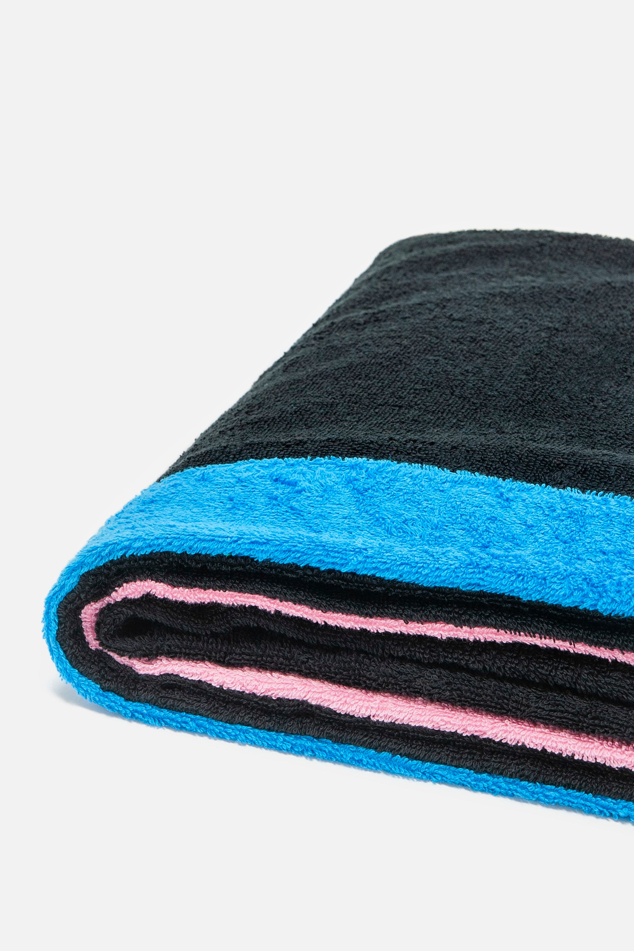Our Signature line redefines beach towel elegance. Crafted from premium Egyptian cotton, this striking black towel delivers exceptional absorbency and softness, enhanced by a vibrant multicolor border for a playful yet sophisticated touch. Perfect for making a bold statement on sunny days!