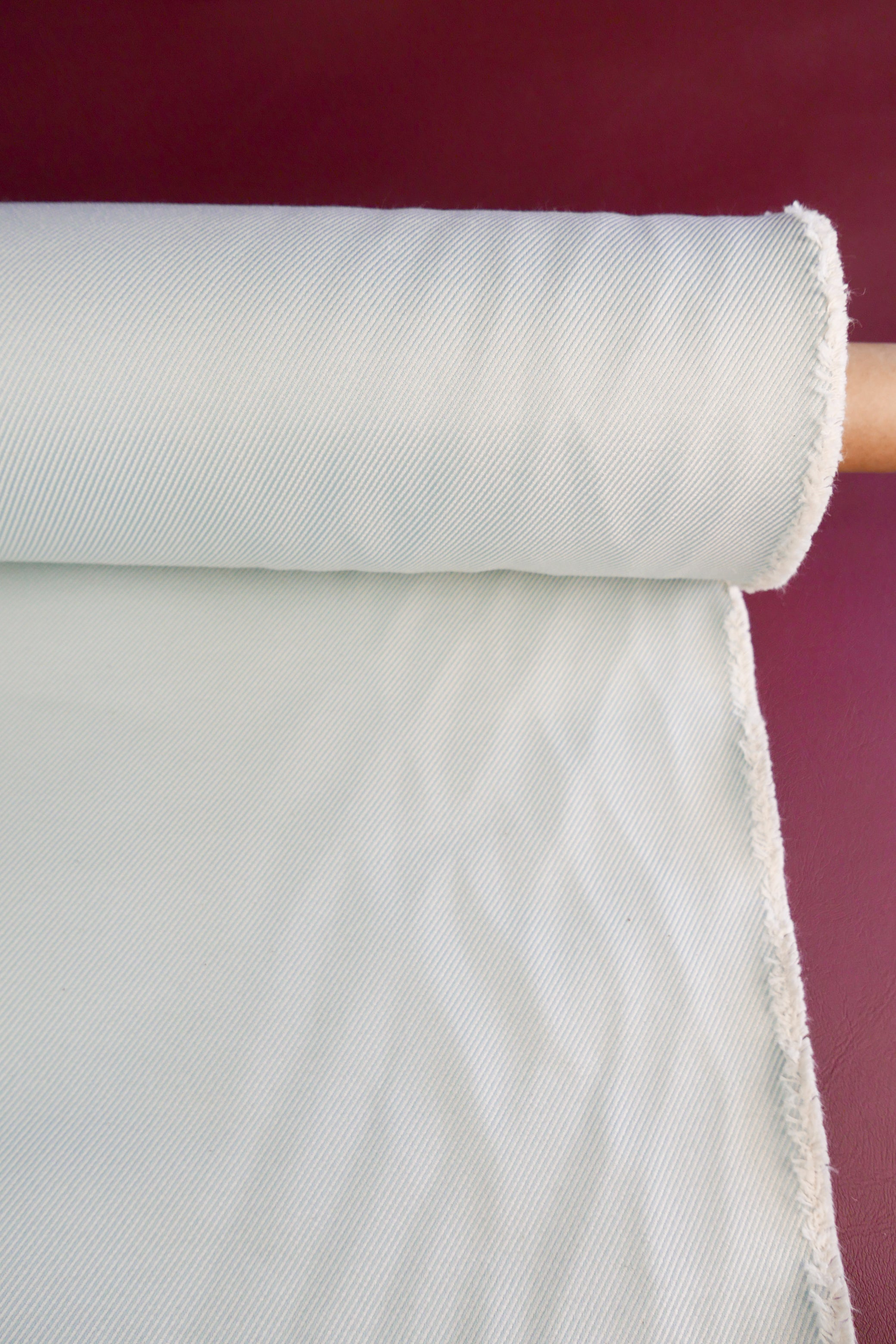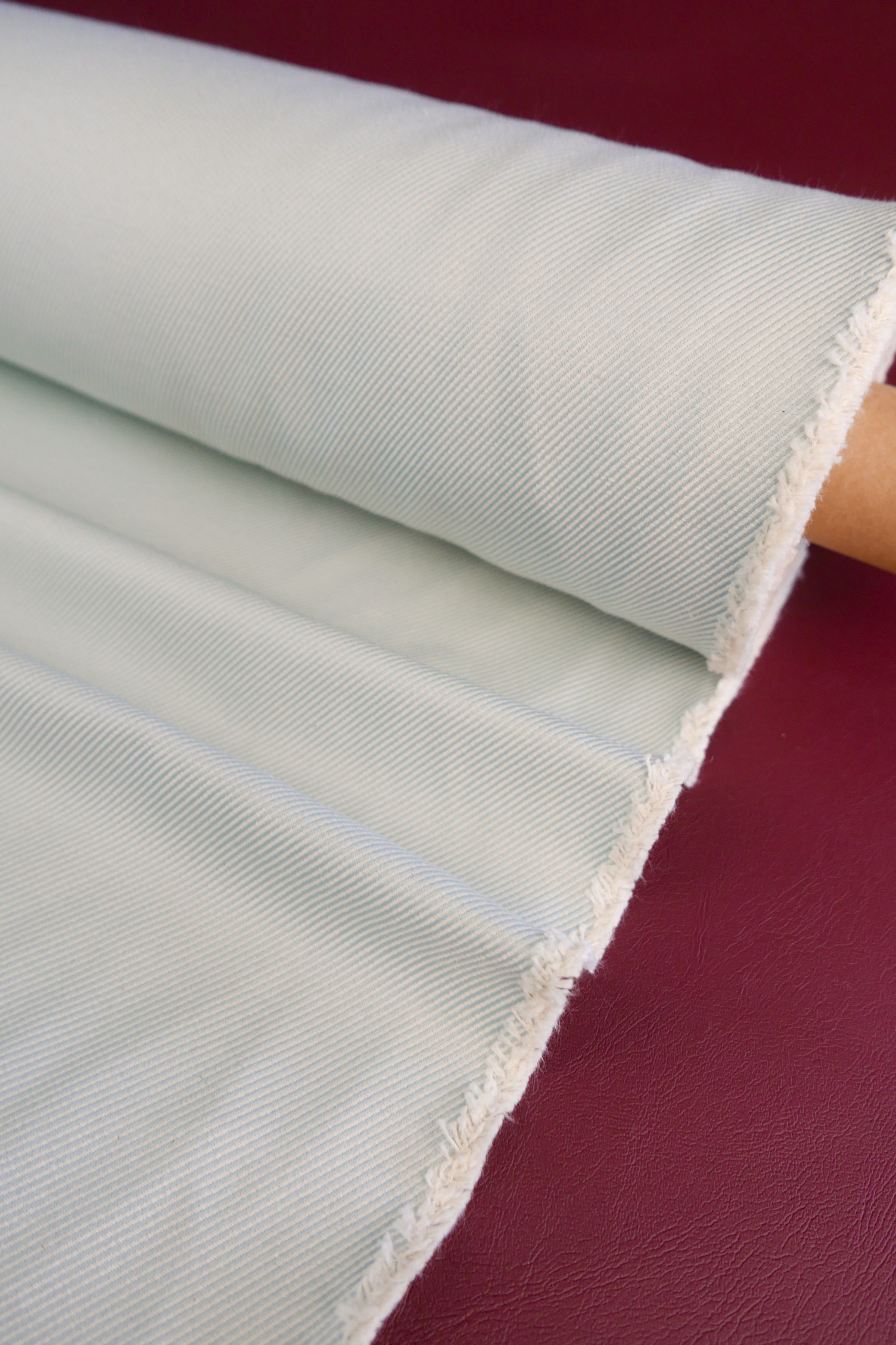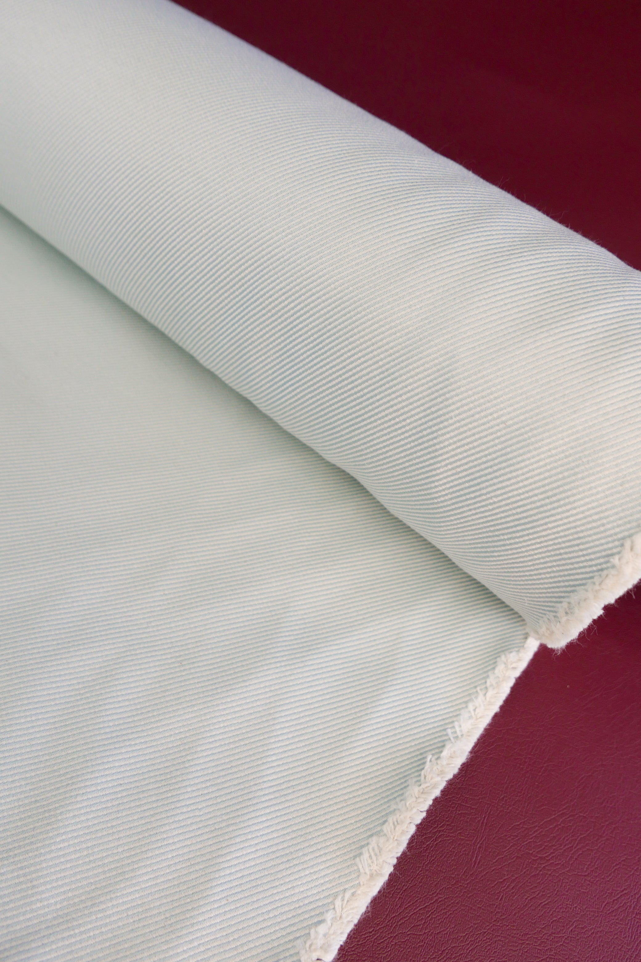 This durable, commercial-grade upholstery fabric features a woven drill in mint blue and off-white. Midweight and holding good structure, this fabric is ideal for indoor upholstery projects, as well as bags, garments and accessories.