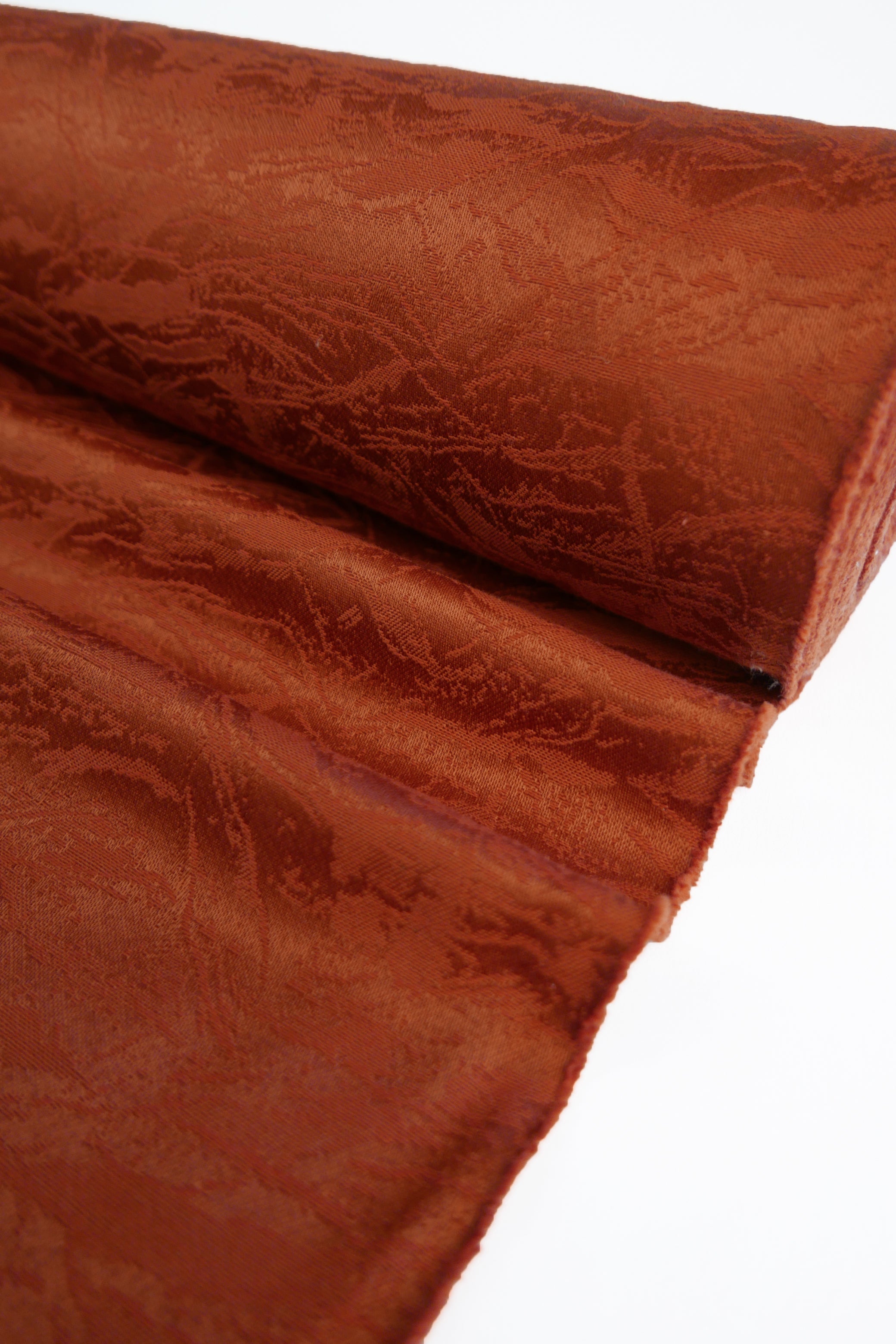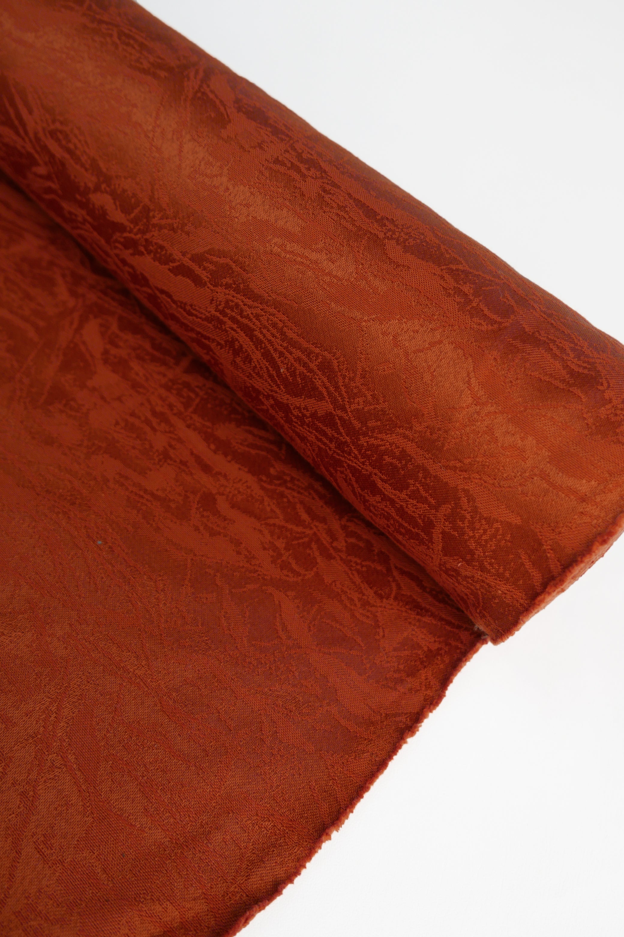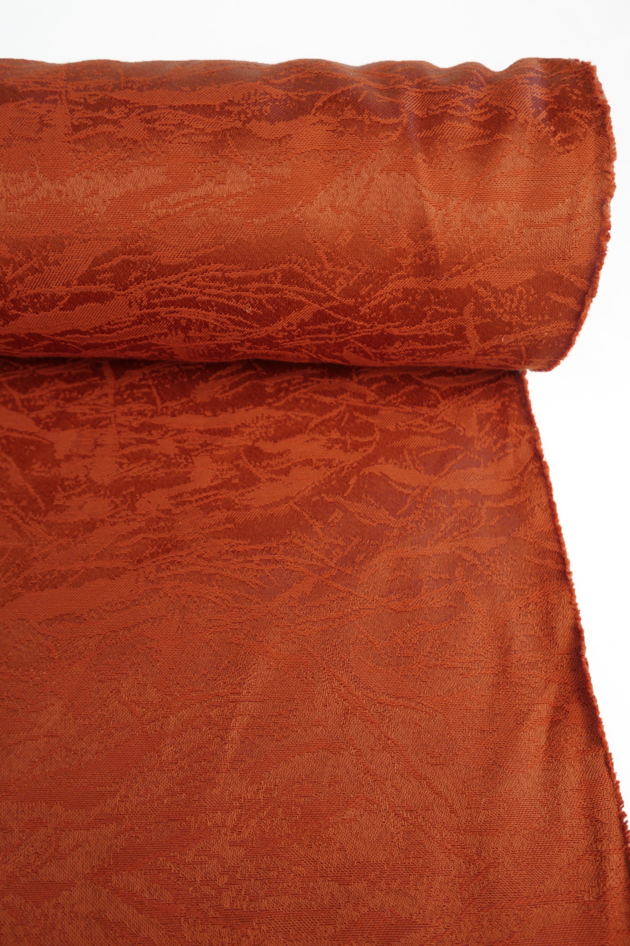This durable, commercial-grade upholstery fabric features a raised abstract design in burnt orange. Midweight and holding good structure, this fabric is ideal for indoor upholstery projects, as well as bags, garments and accessories.