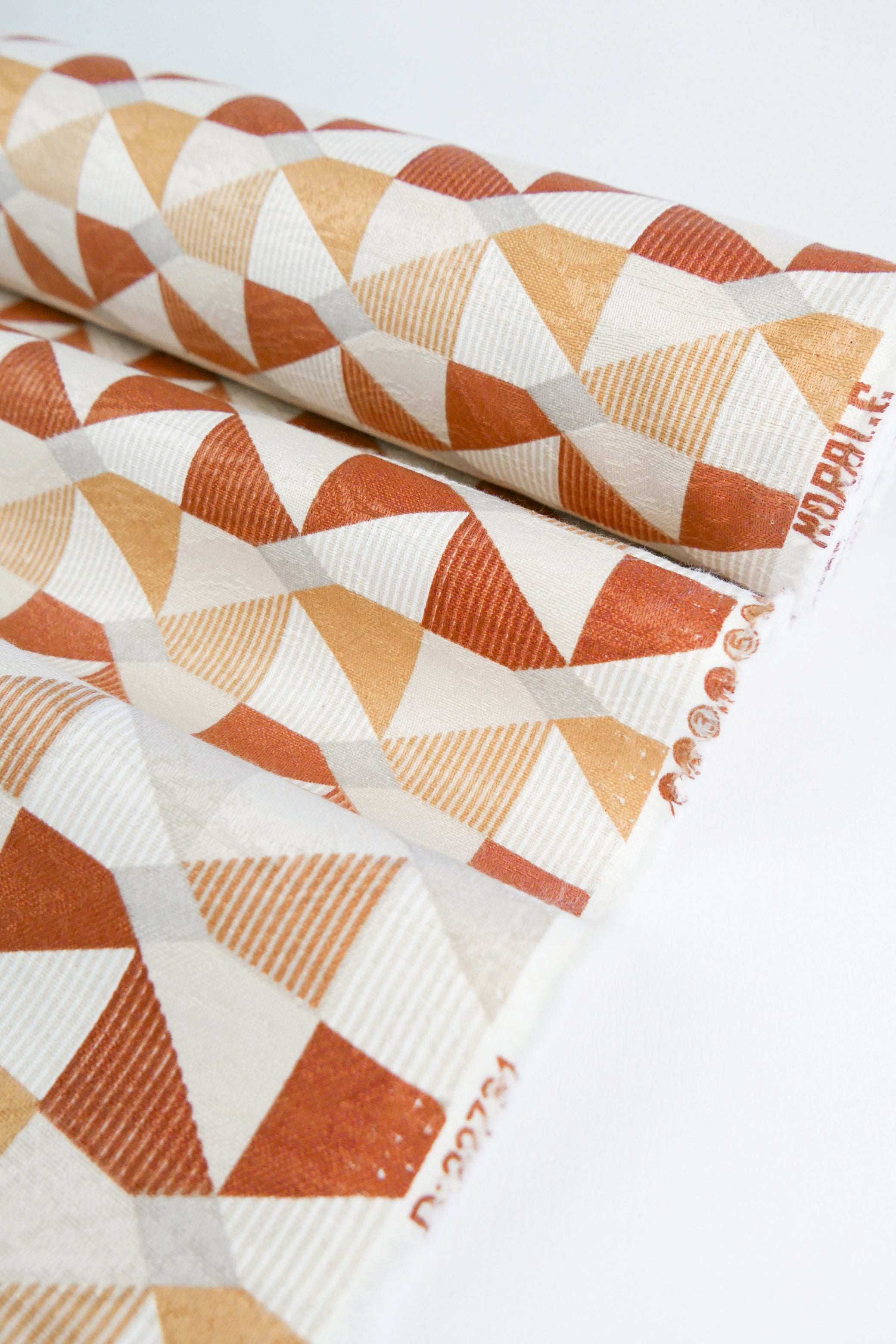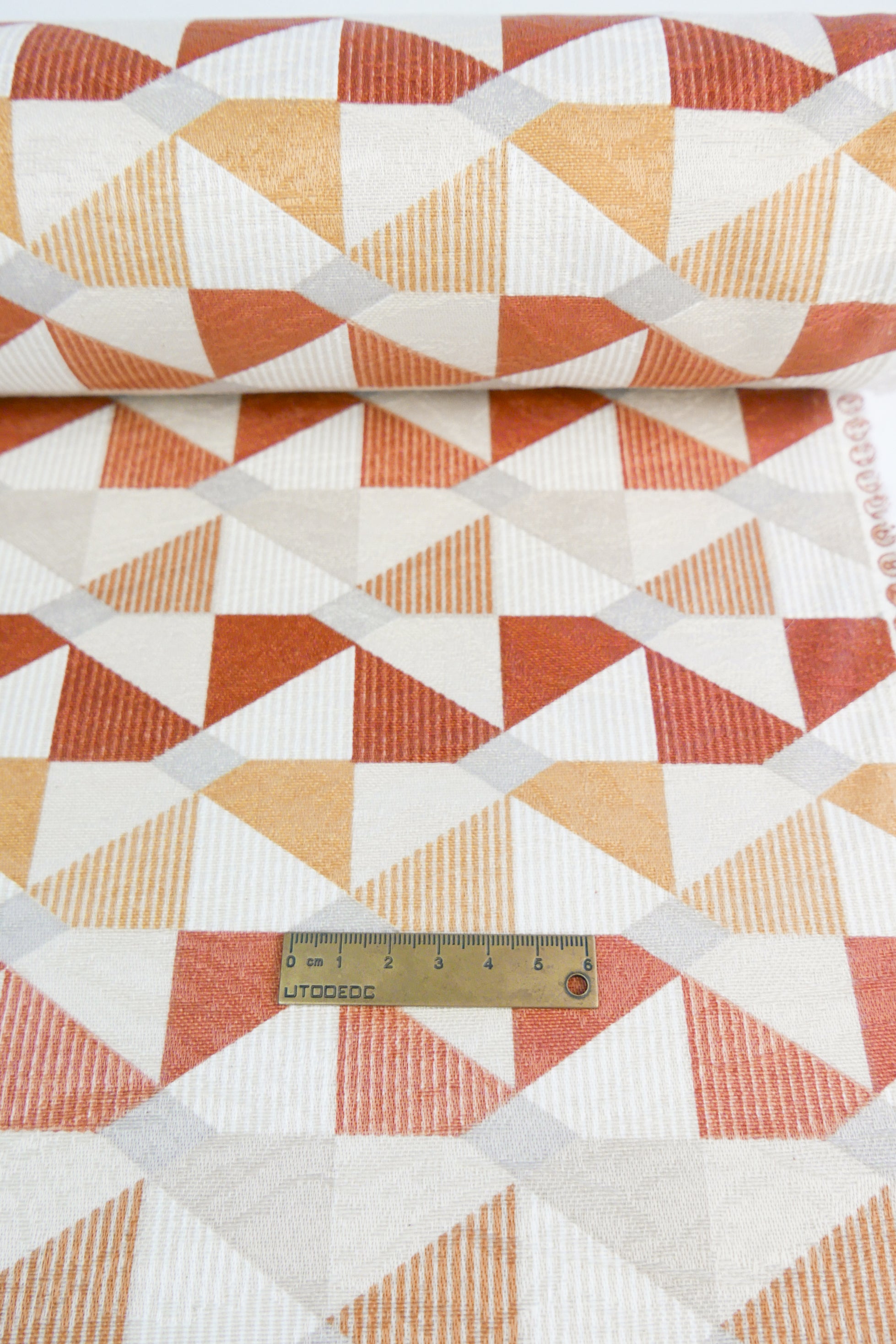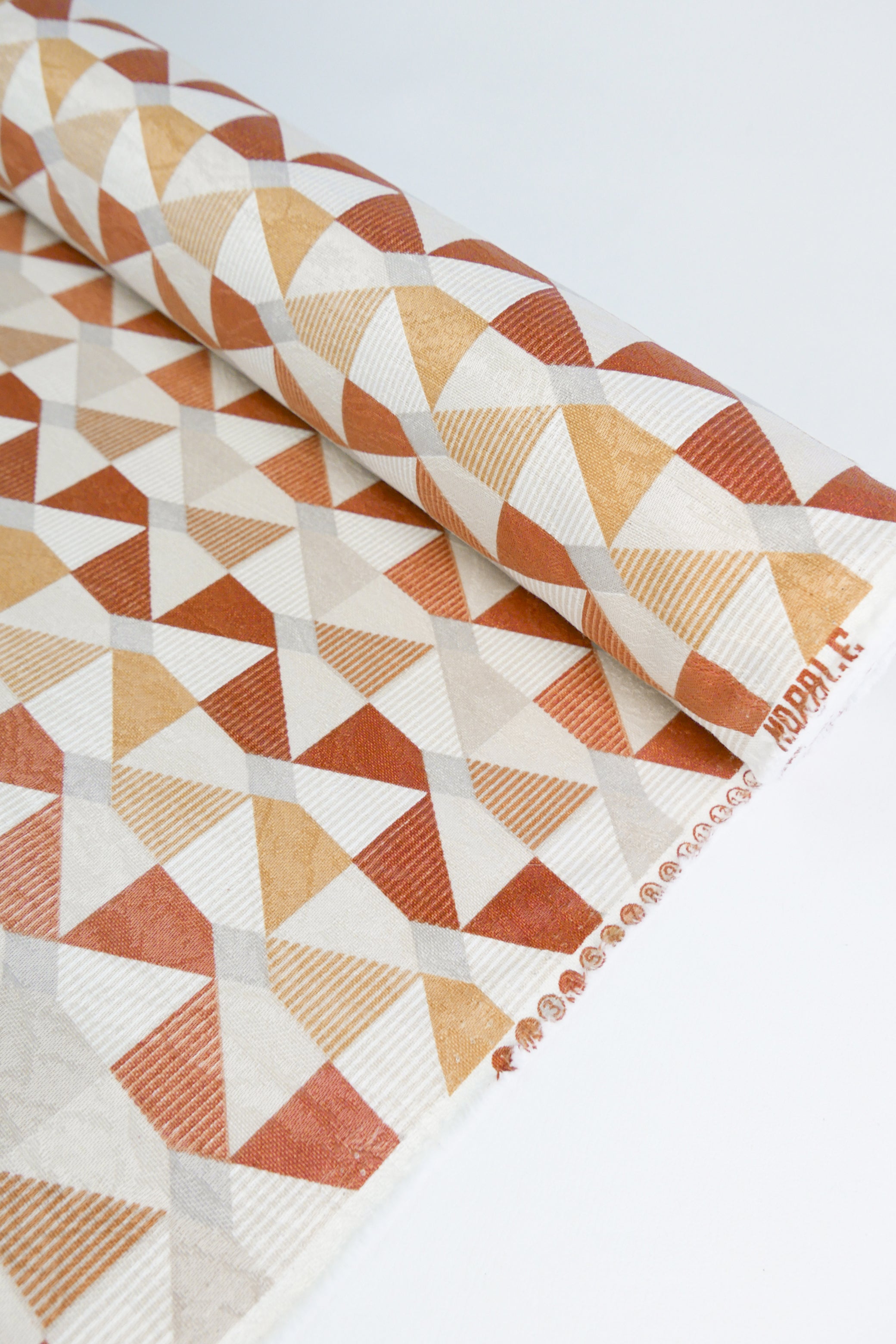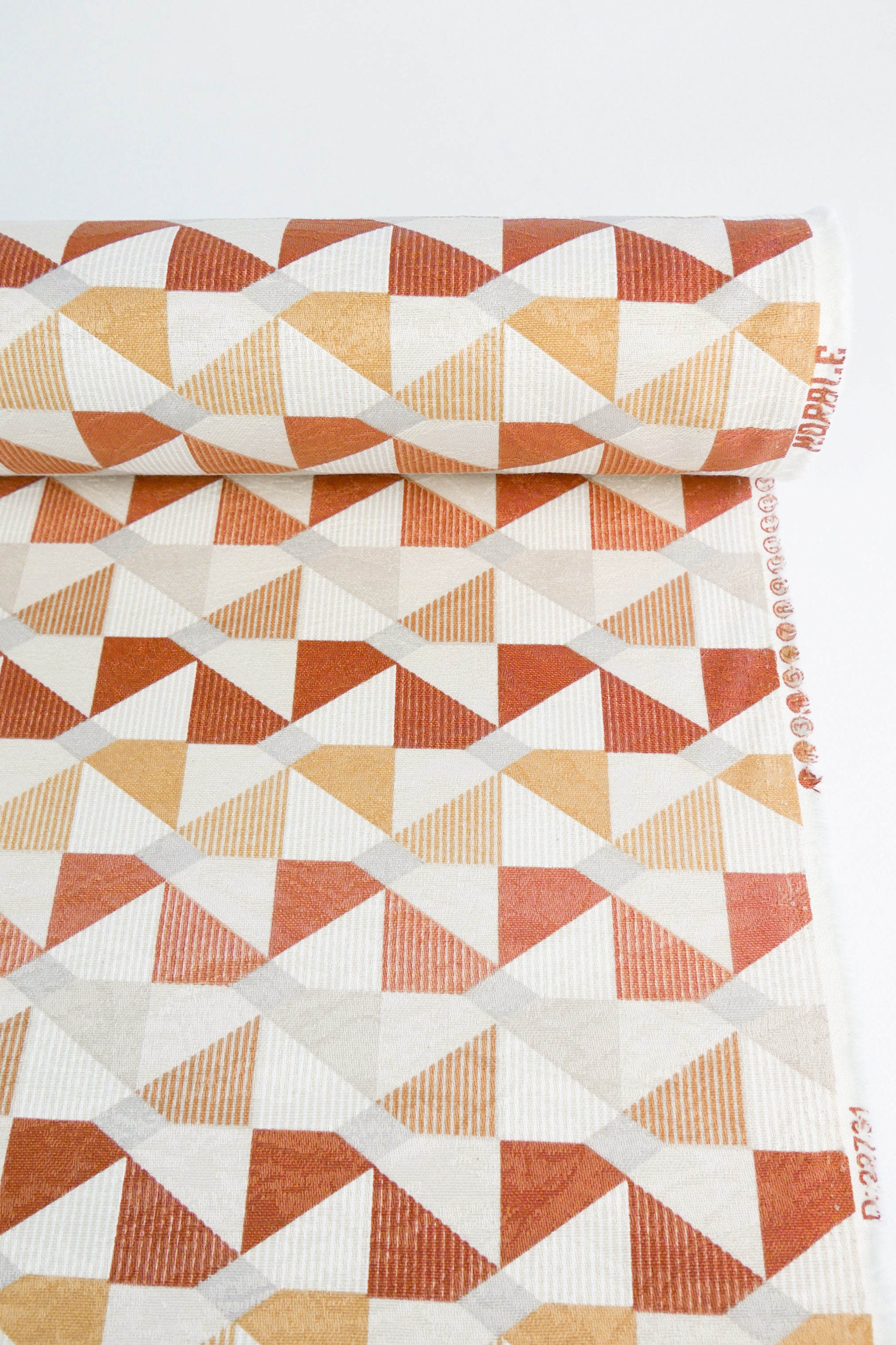 This durable, commercial-grade upholstery jacquard features a geometric print in ochre, burnt orange and cement with a subtle raised abstract design. Midweight and holding good structure, this fabric is ideal for indoor upholstery projects, as well as bags, garments and accessories.