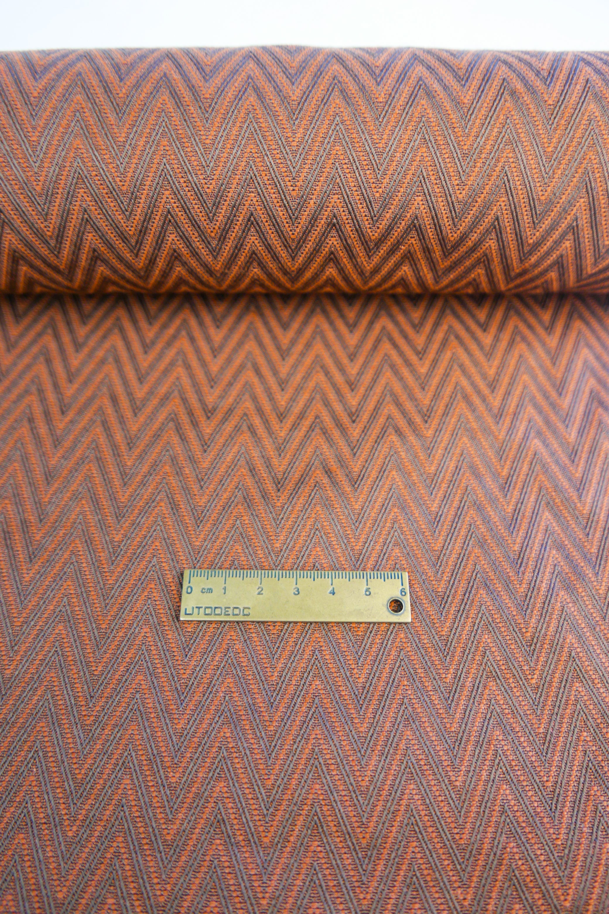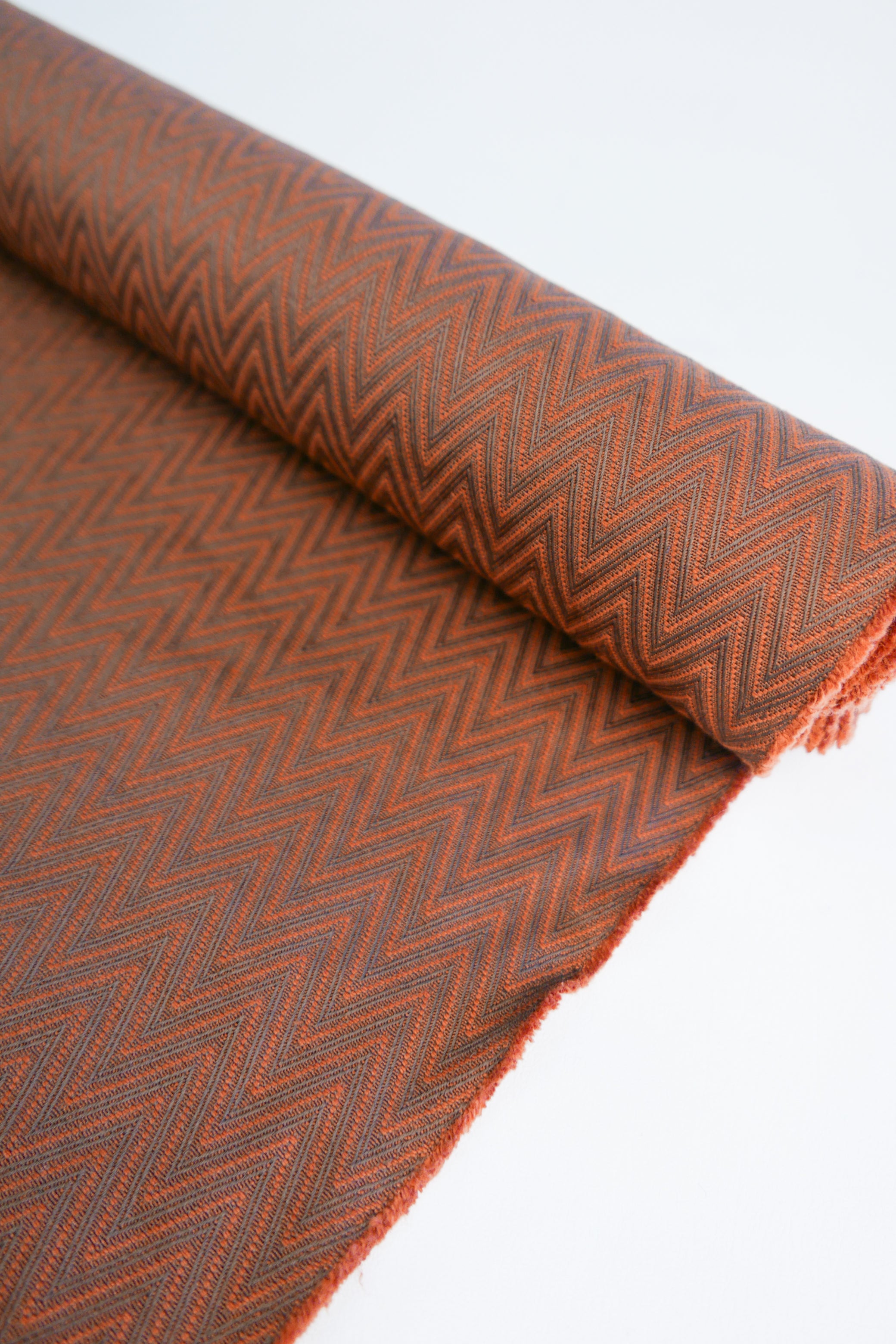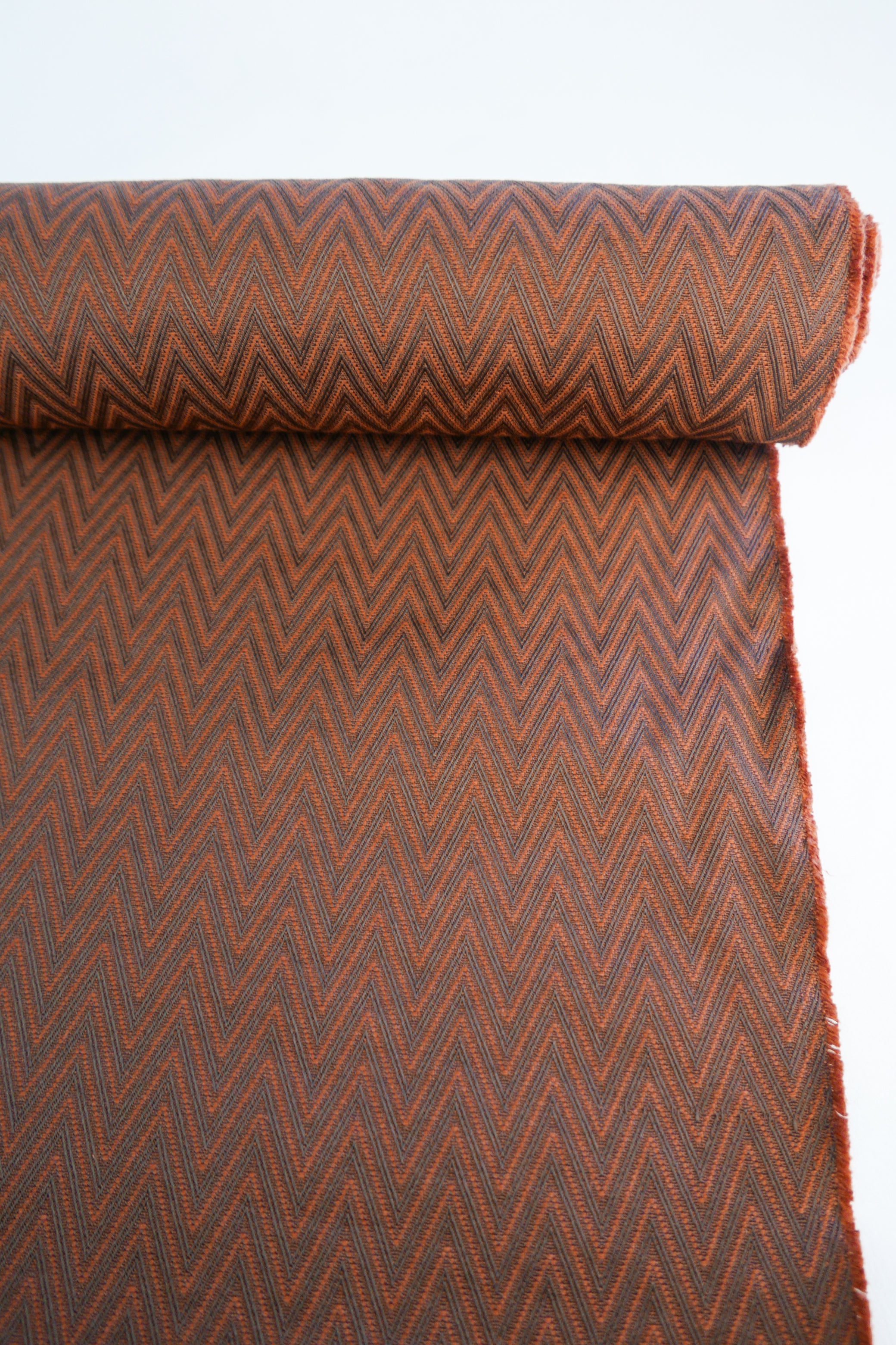 This durable, commercial-grade upholstery fabric features a woven zigzag design in ember orange and deep brown. Midweight and holding good structure, this fabric is ideal for indoor upholstery projects, as well as bags, garments and accessories.