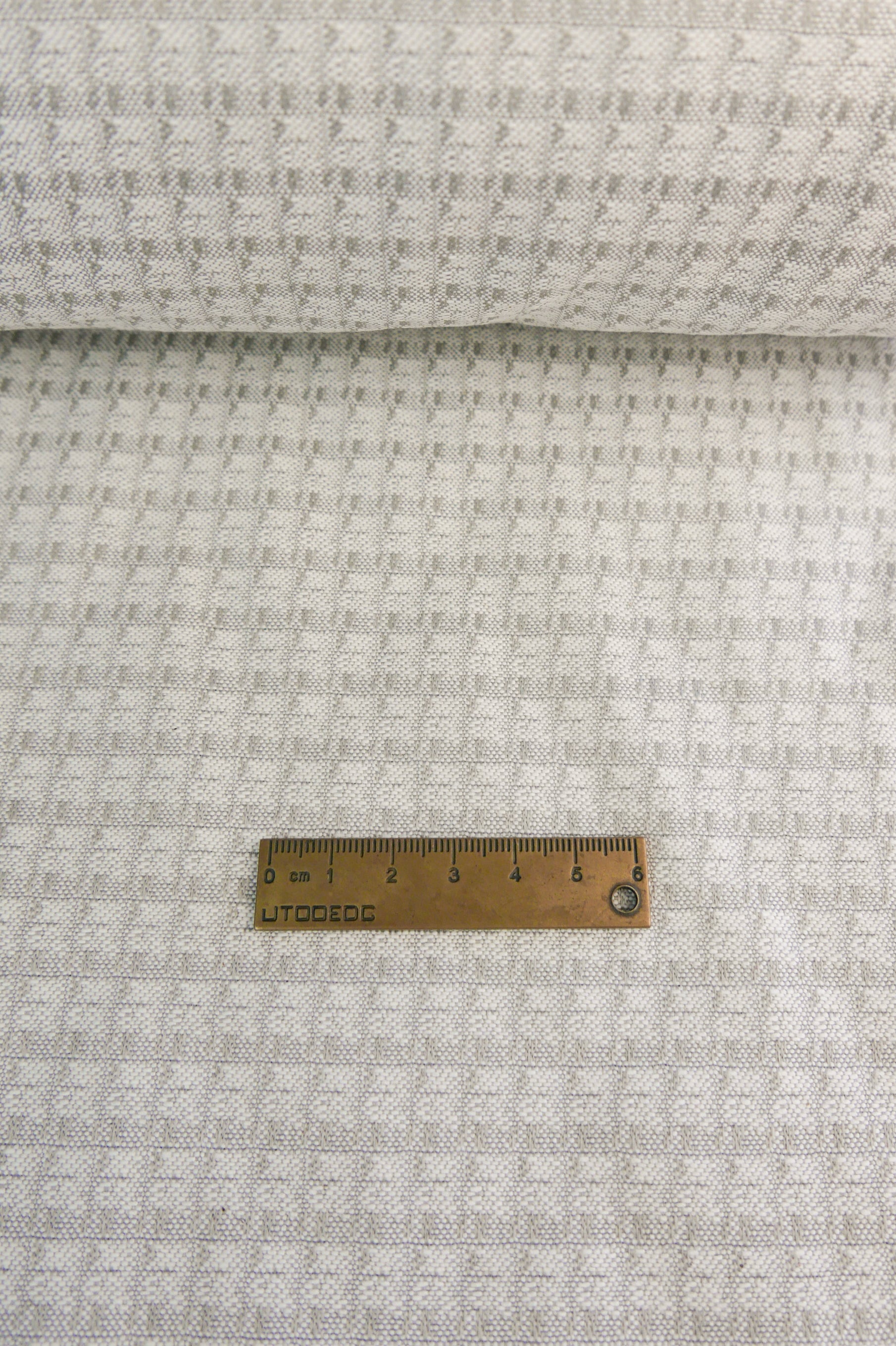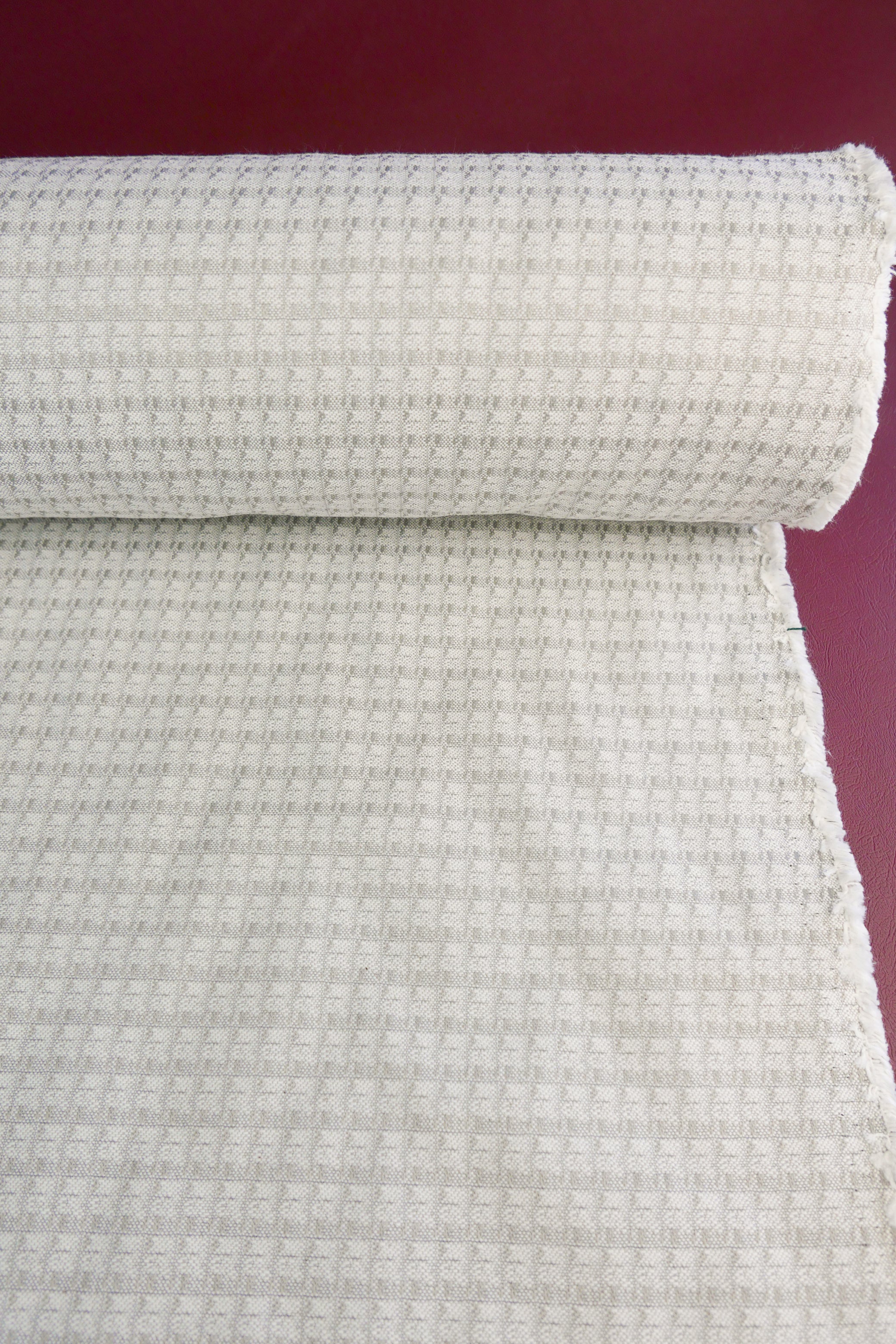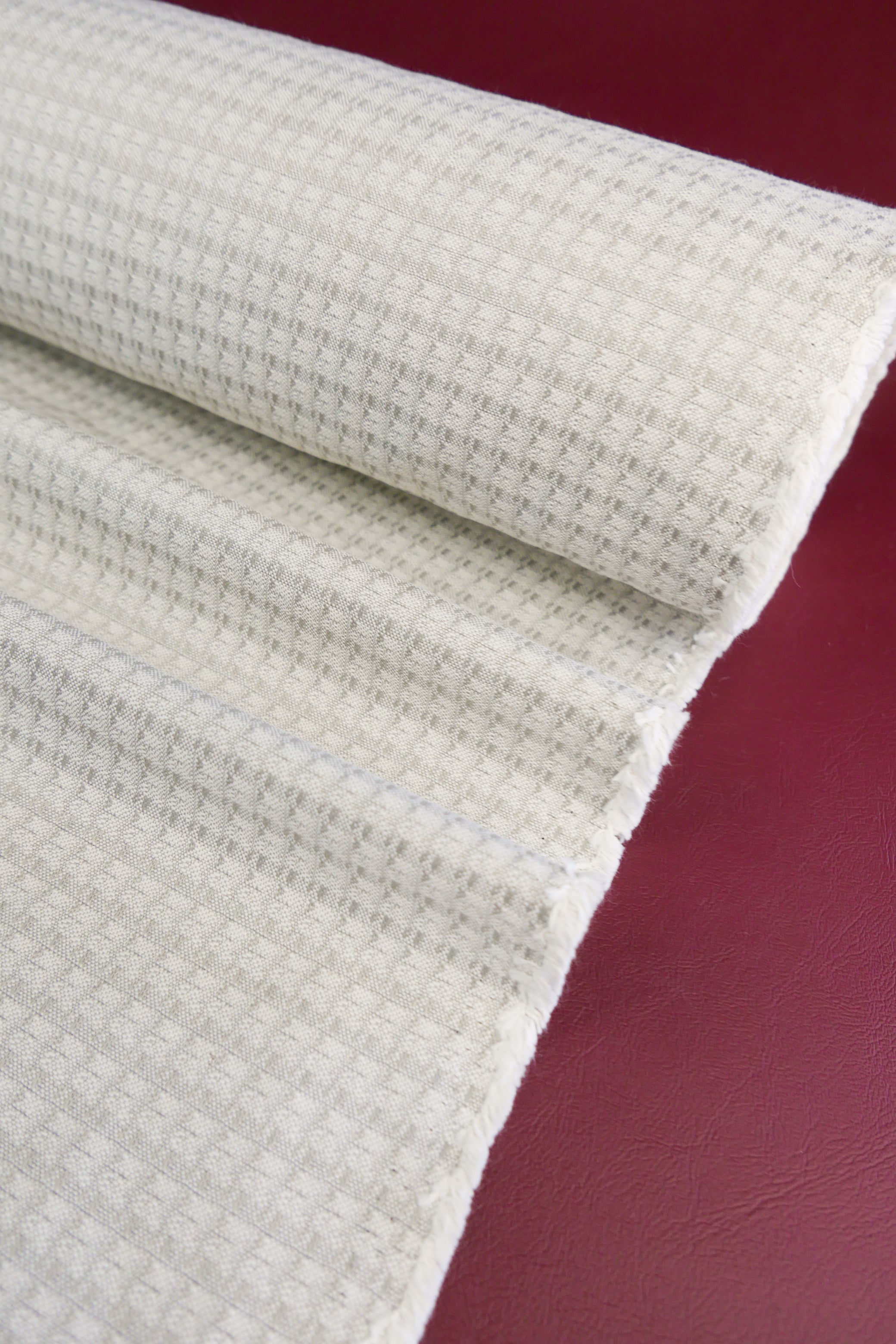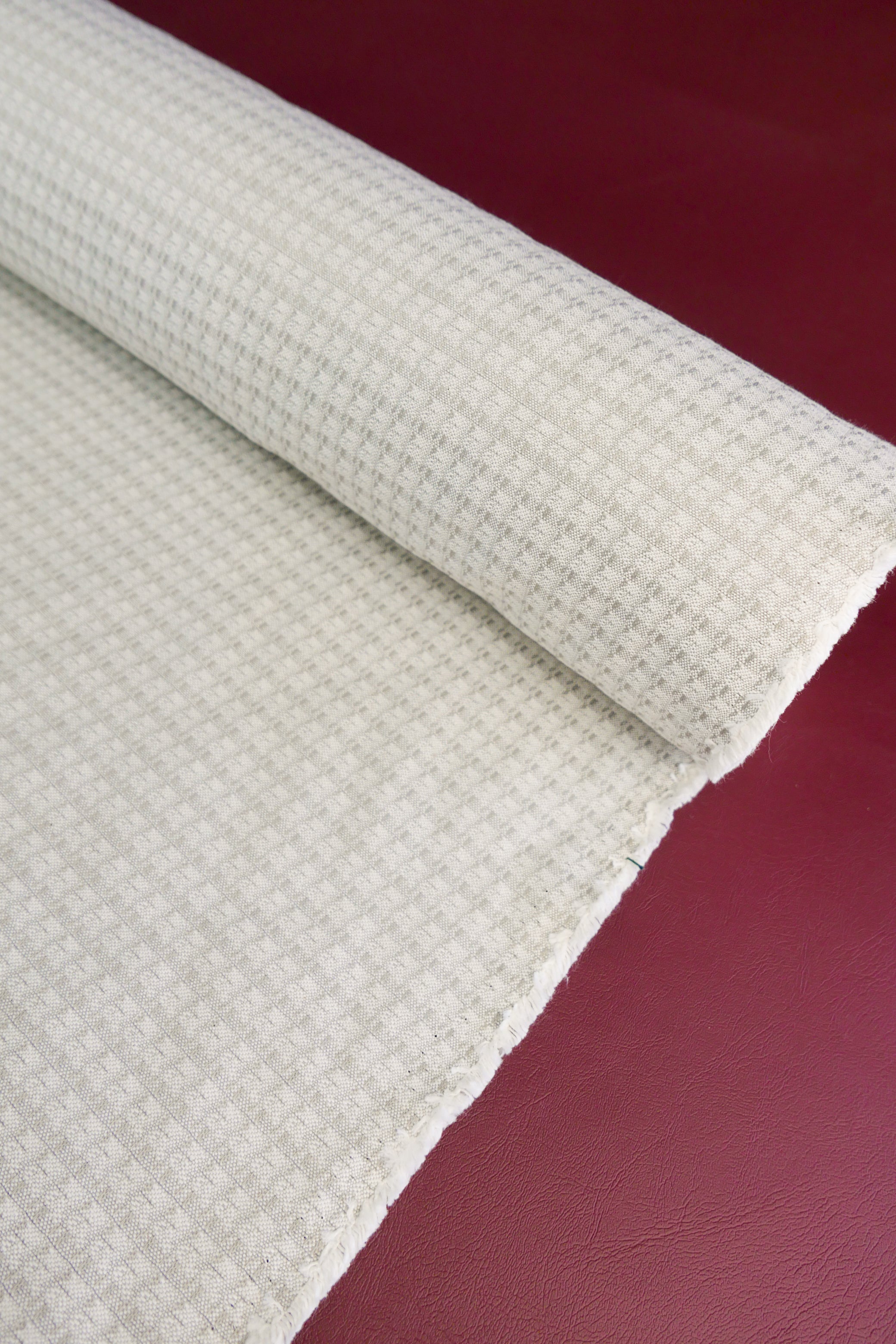 This durable, commercial-grade upholstery fabric features a woven abstract grid design in nickel and off-white. Midweight and holding good structure, this fabric is ideal for indoor upholstery projects, as well as bags, garments and accessories.