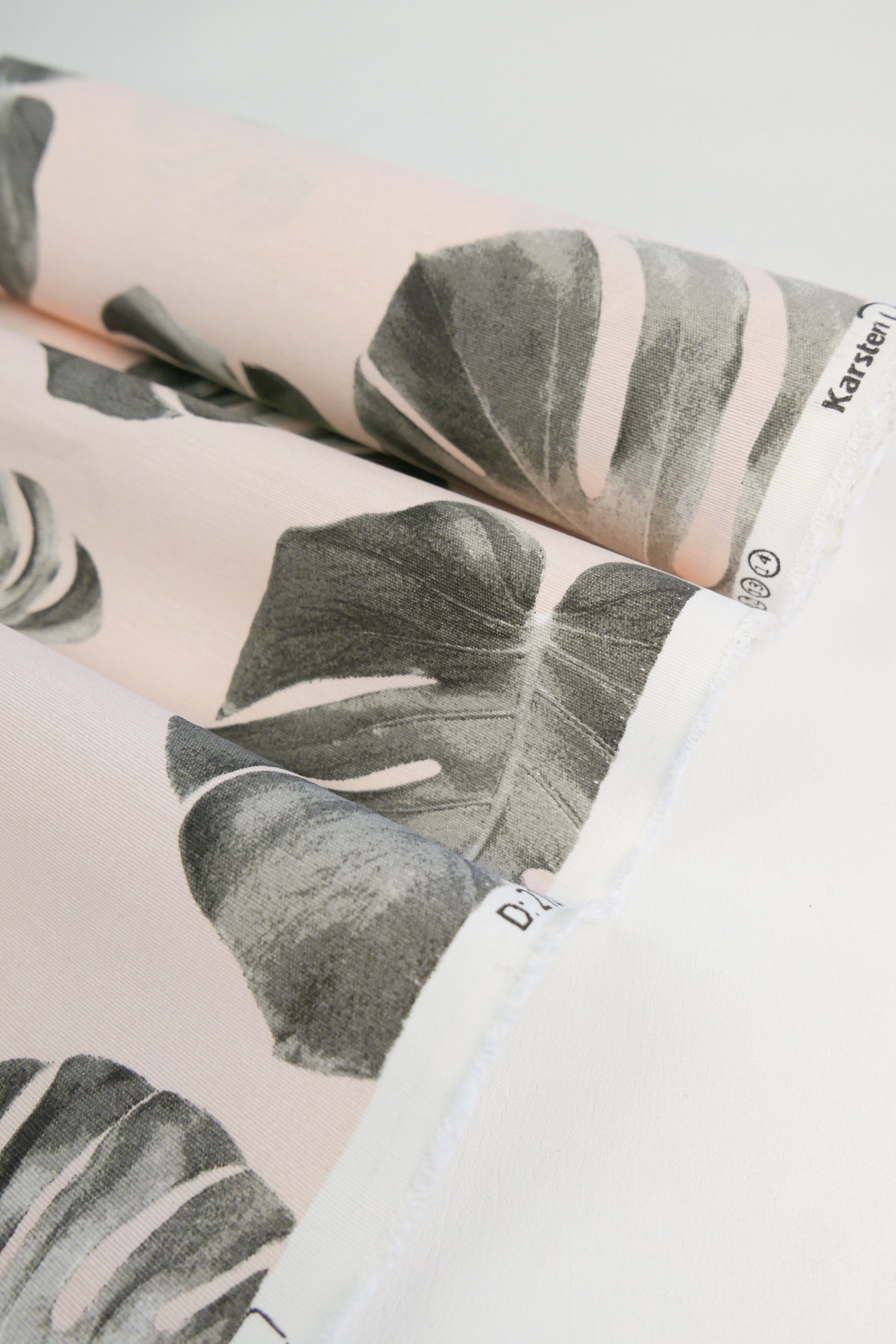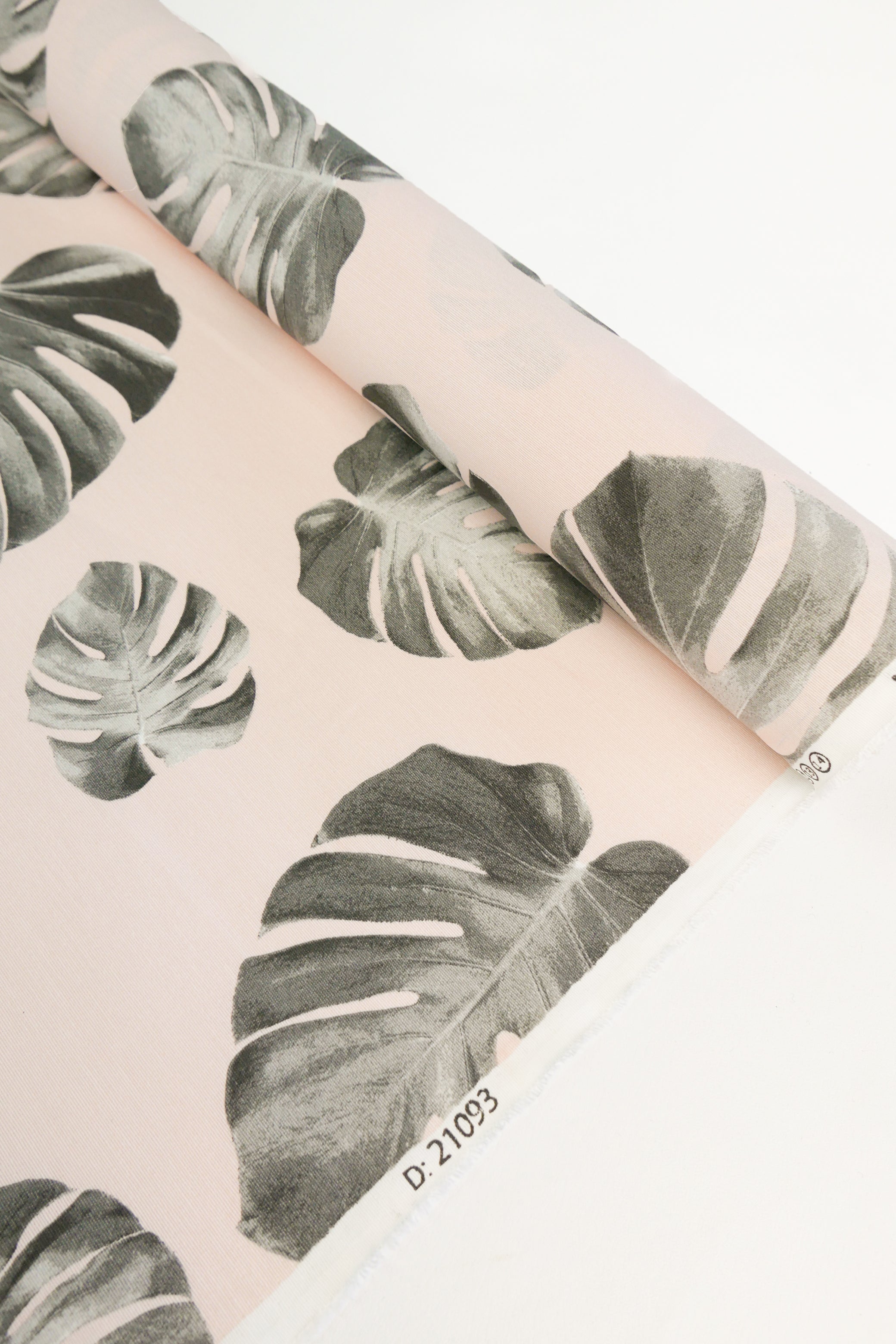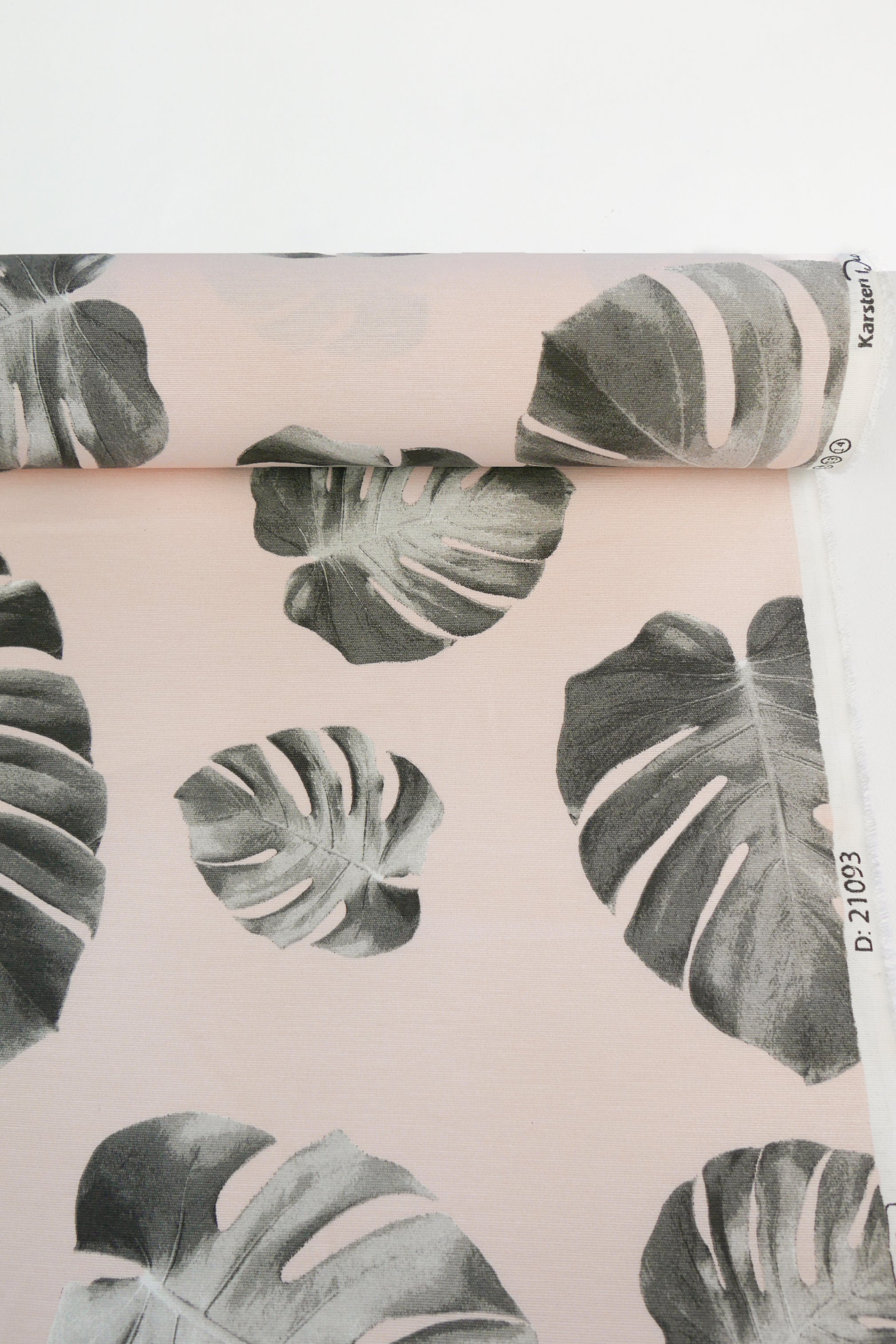 This durable, commercial-grade upholstery fabric features a large monstera leaf print in grey on a soft pink base cloth. It has a resin coating, making it waterproof, UV resistant/protected and incredibly durable. This fabric is ideal for both indoor and outdoor upholstery projects, as well as bags, garments and accessories.