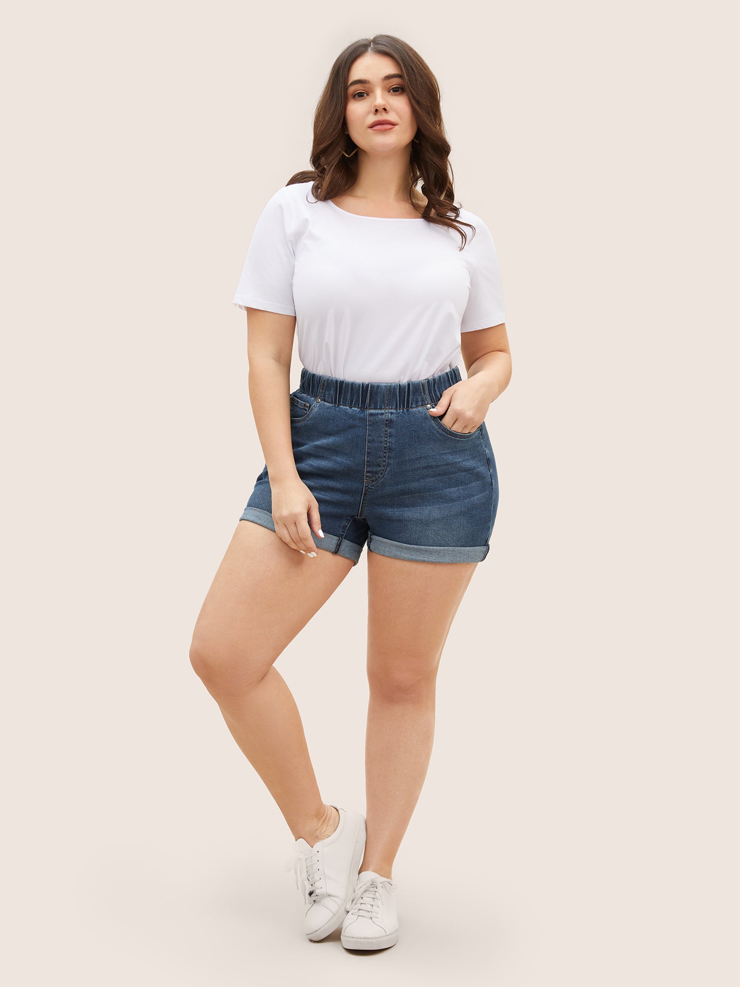 Dark Wash Elastic Waist Roll Hem Denim Shorts