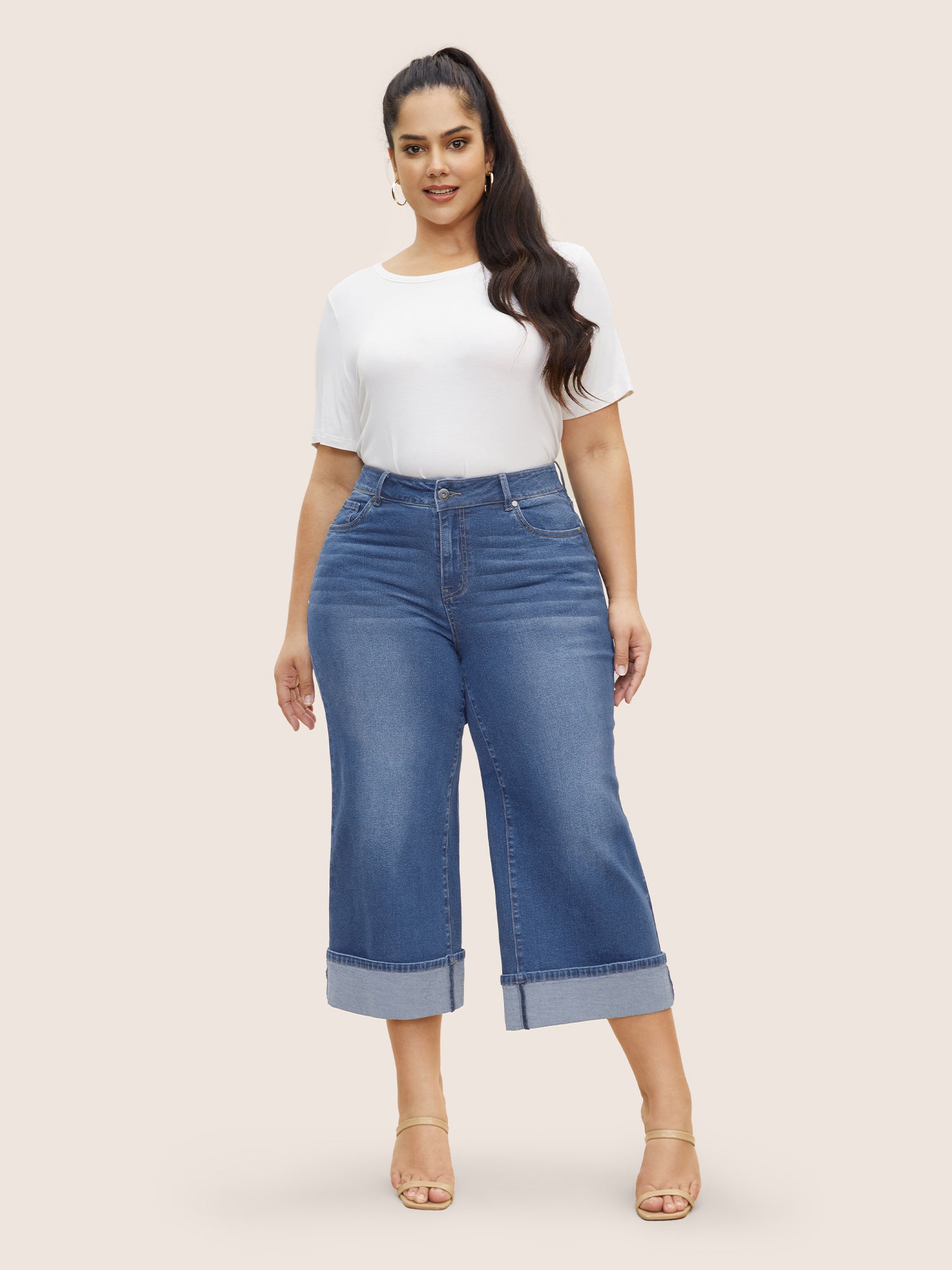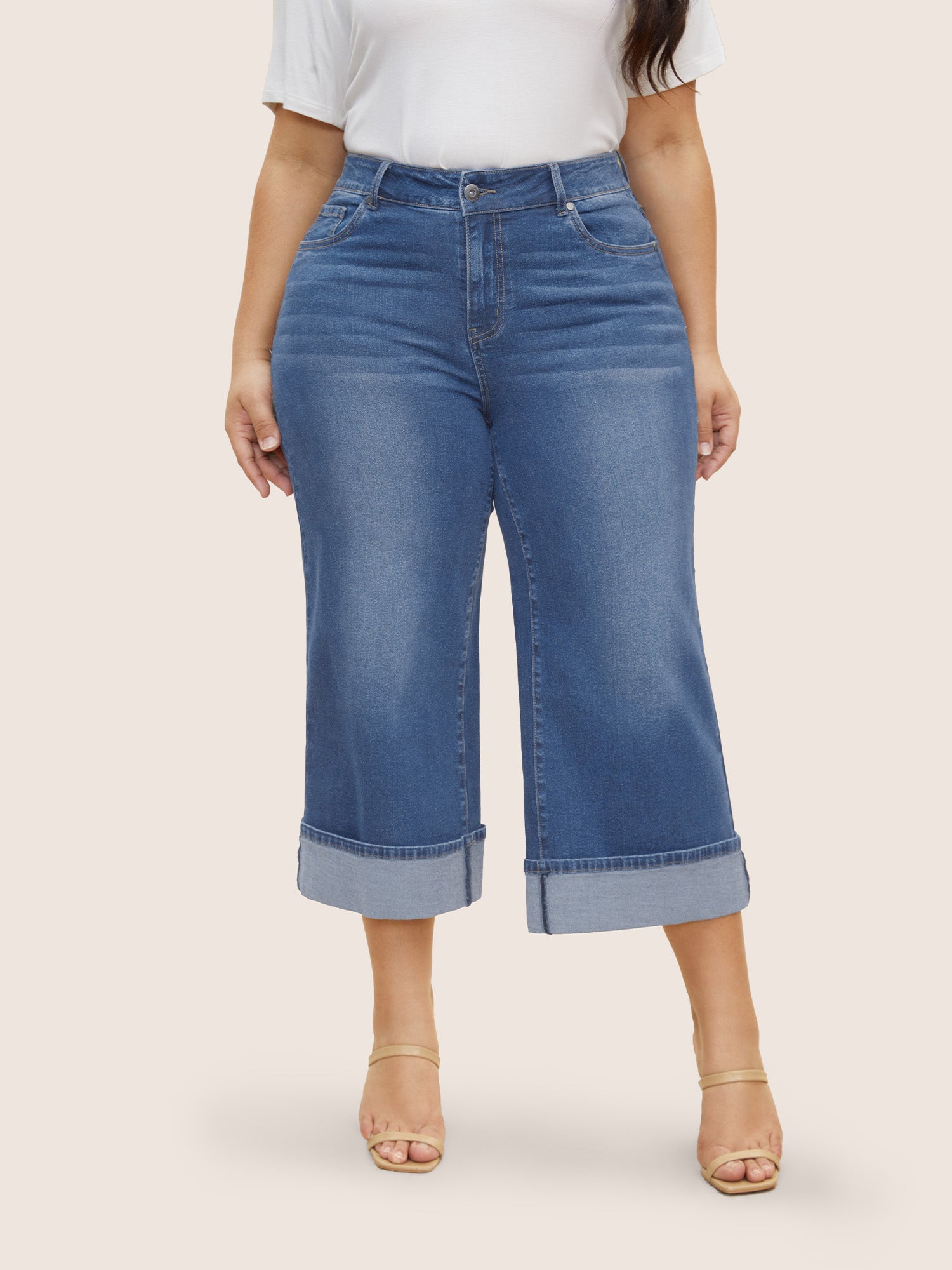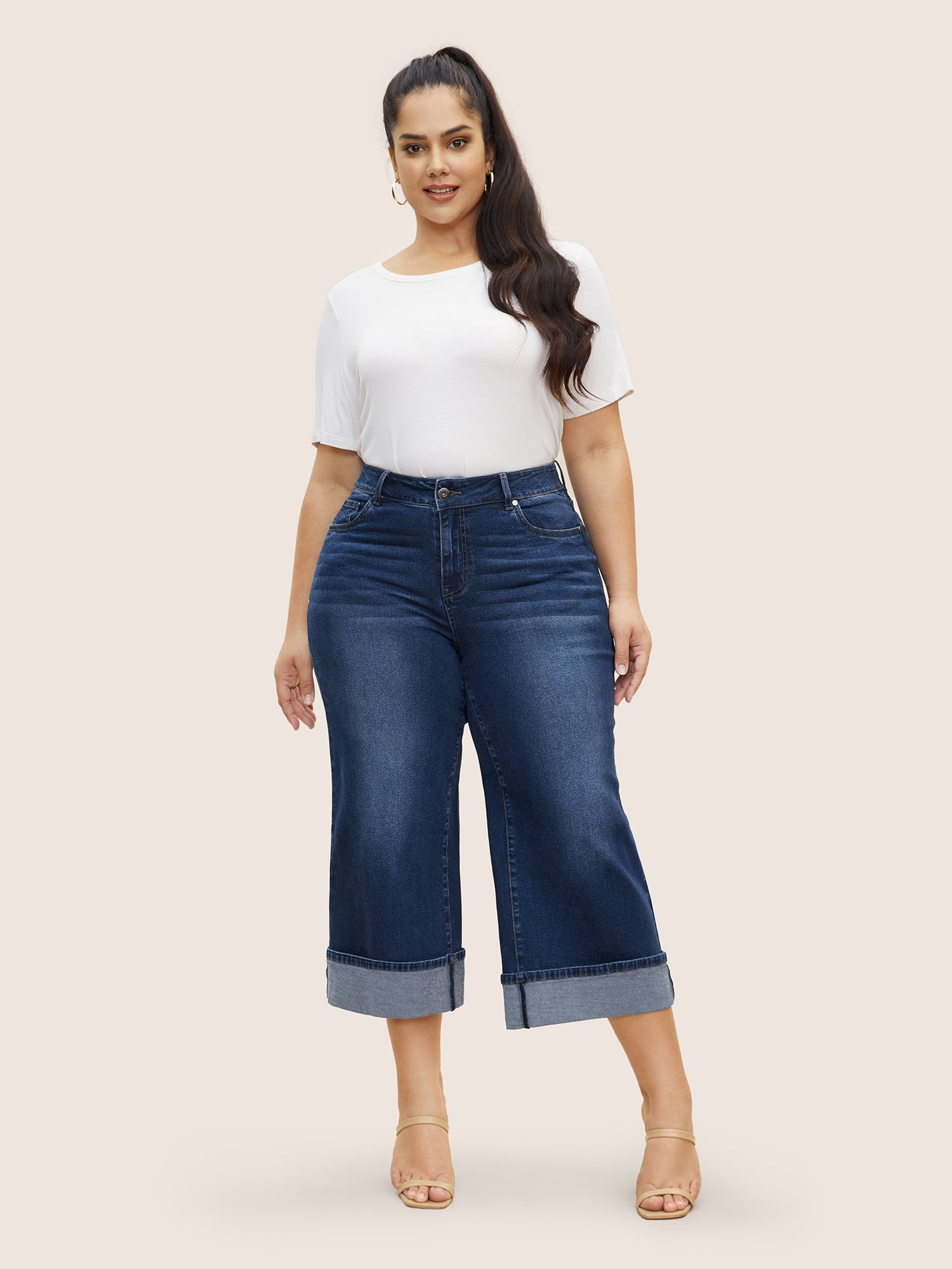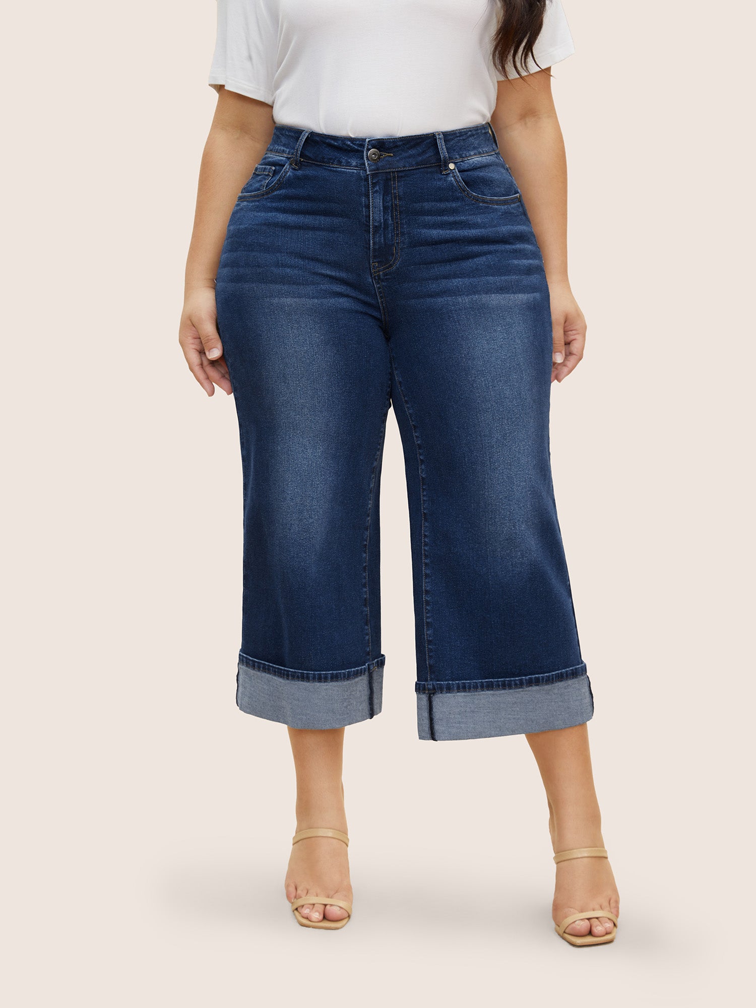 Dark Wash Roll Hem Cropped Wide Leg Jeans