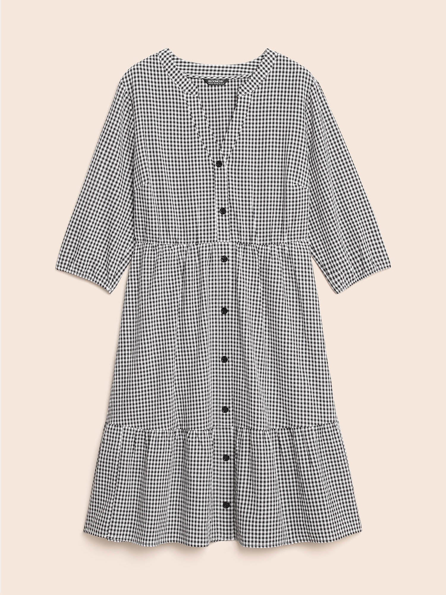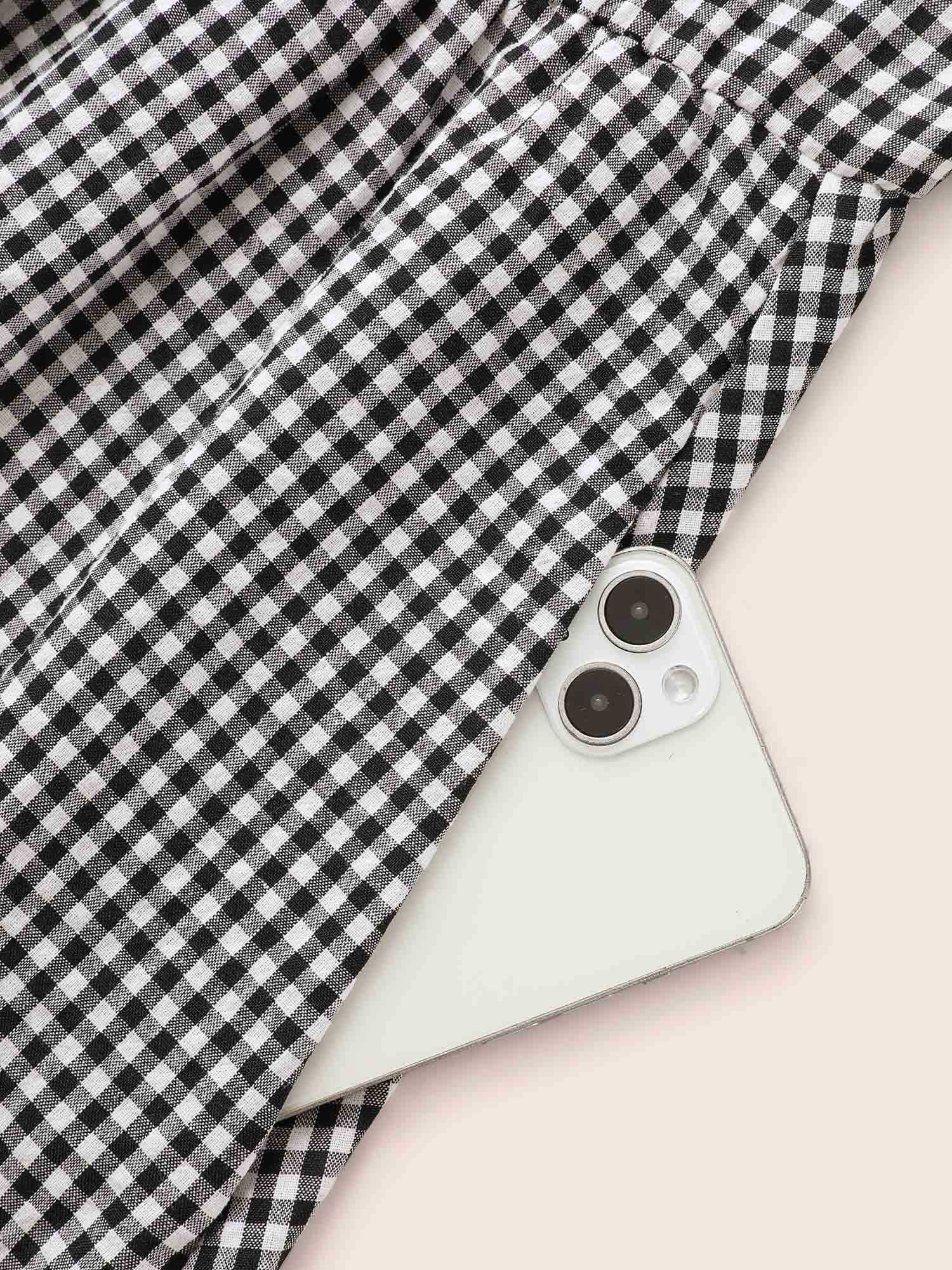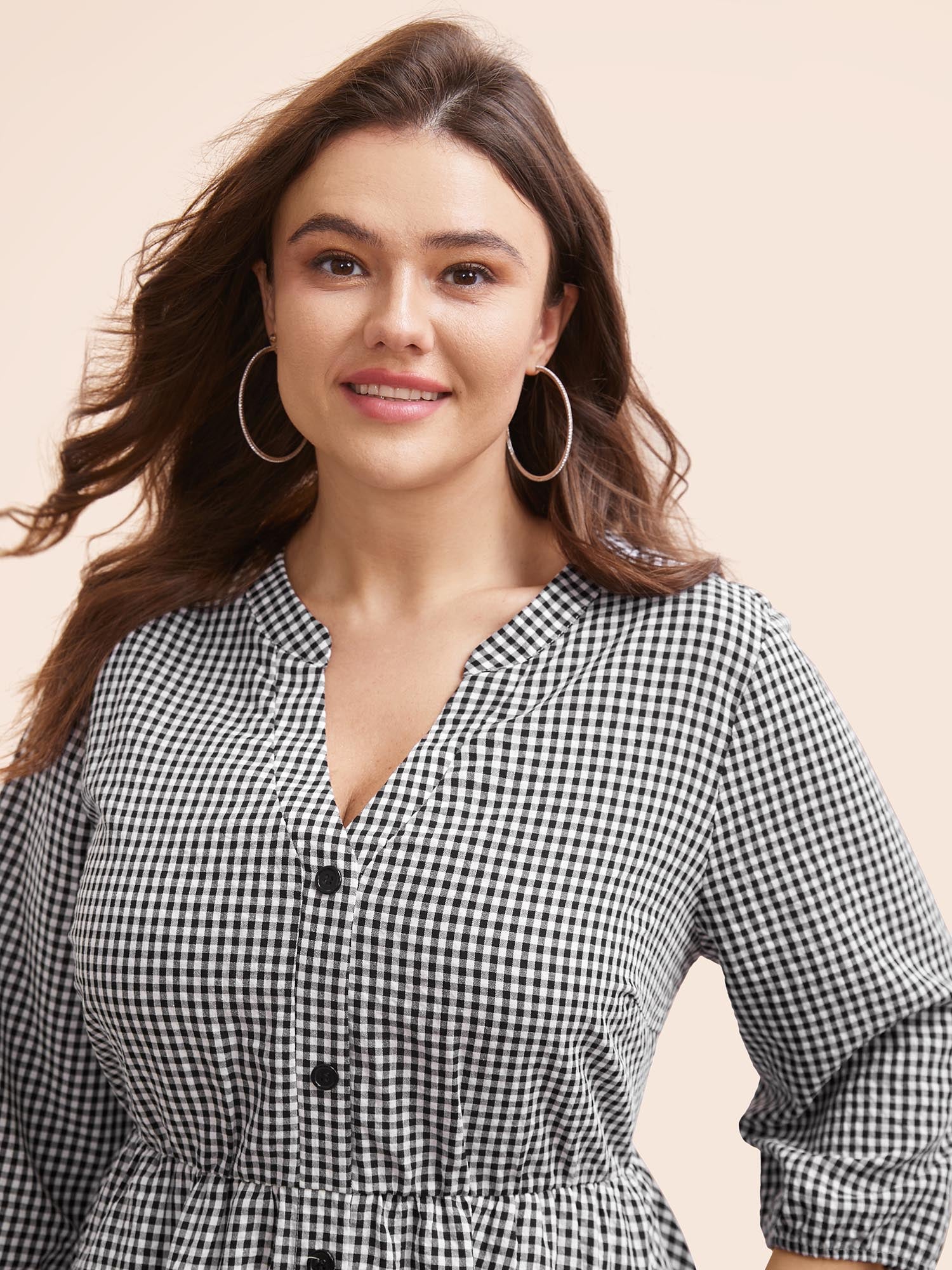 • Gingham Notched Ruffle Hem Lantern Sleeve Dress