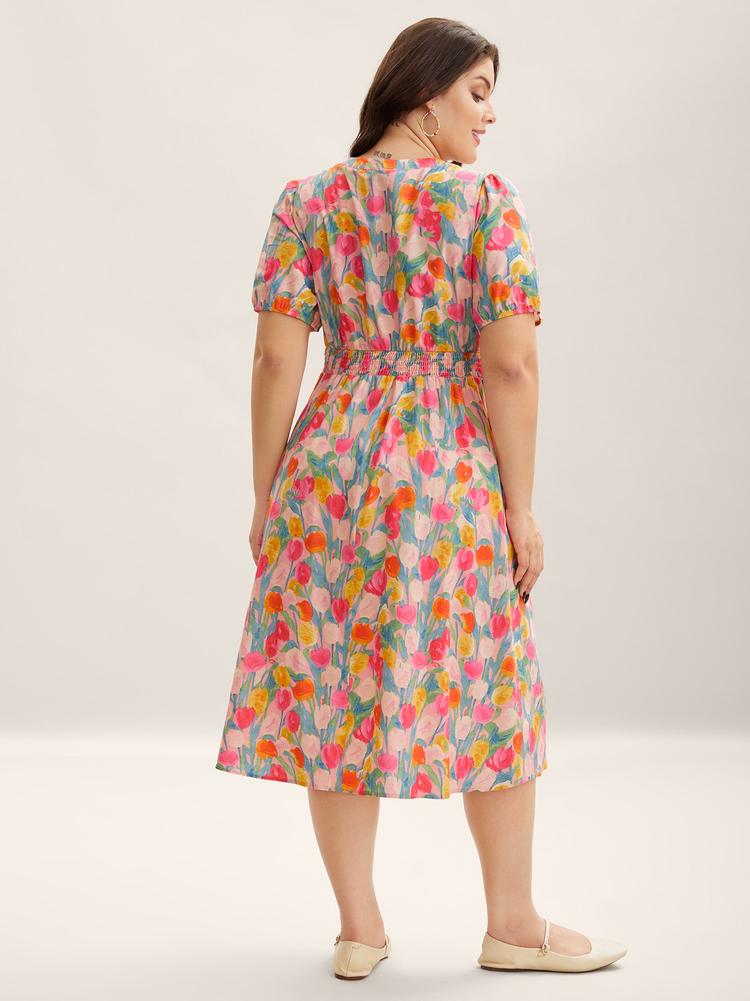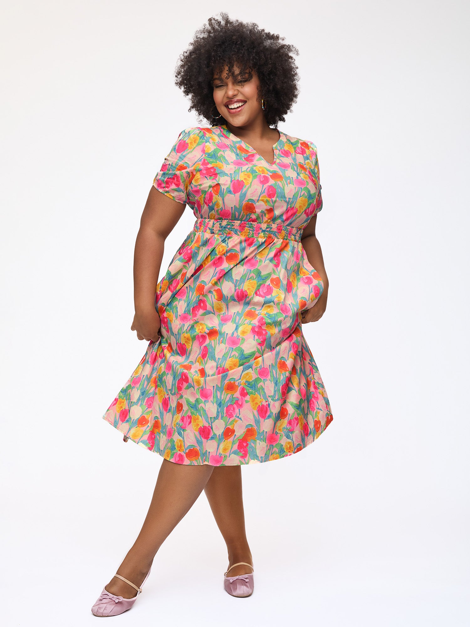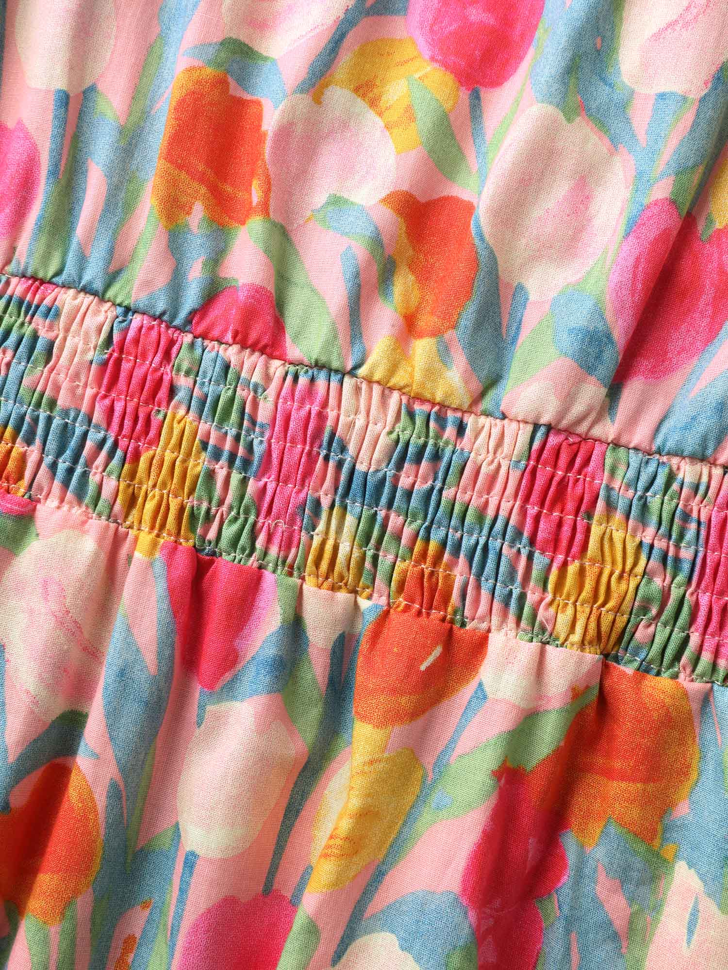 • Cotton Rosy Garden Shirred Waist Pockets Midi Dress