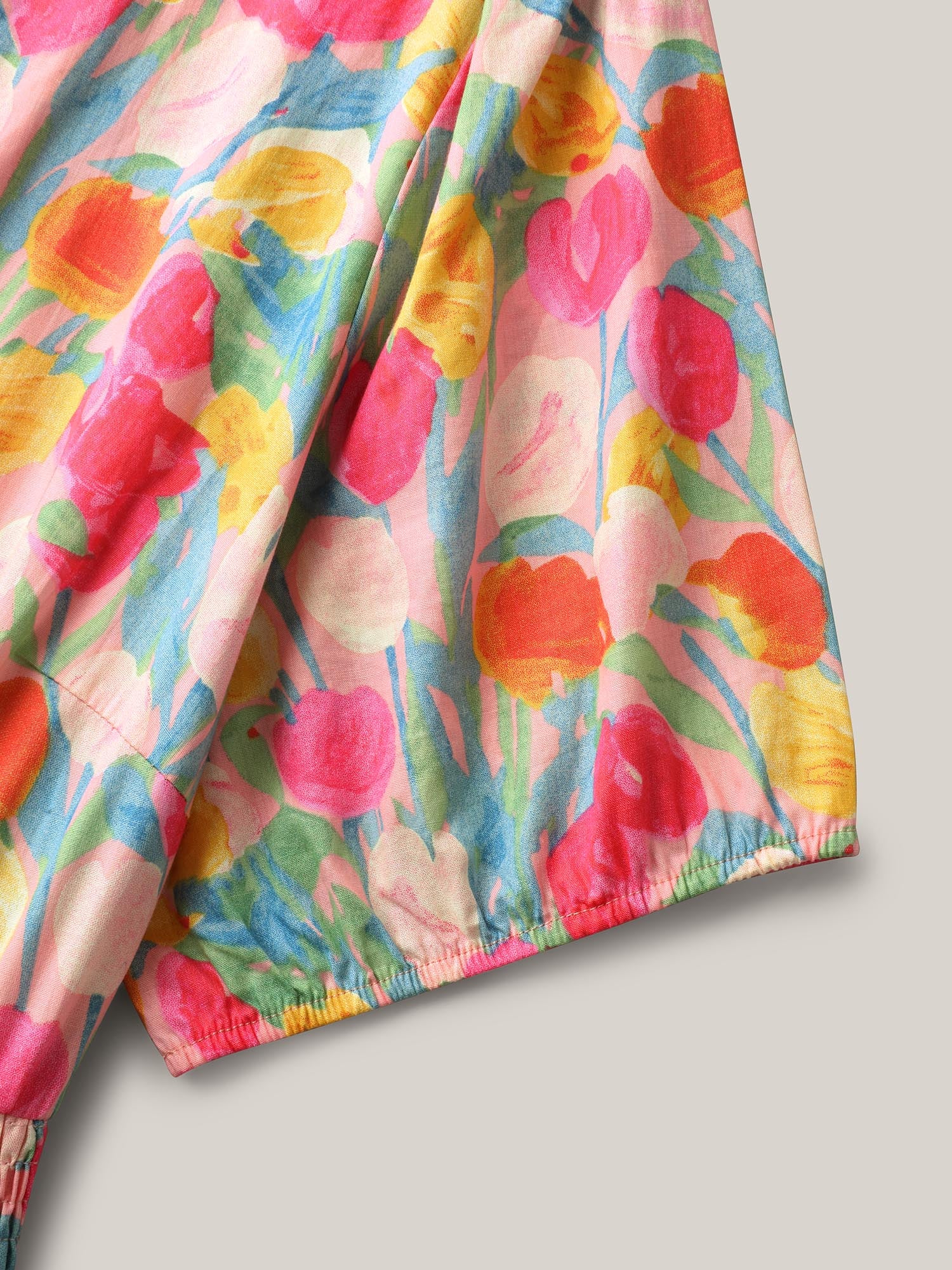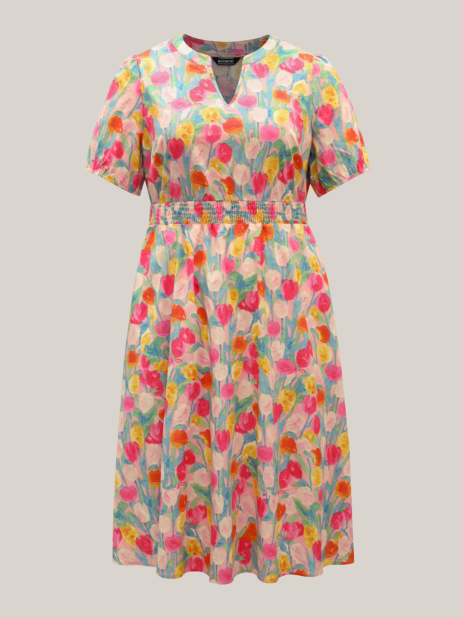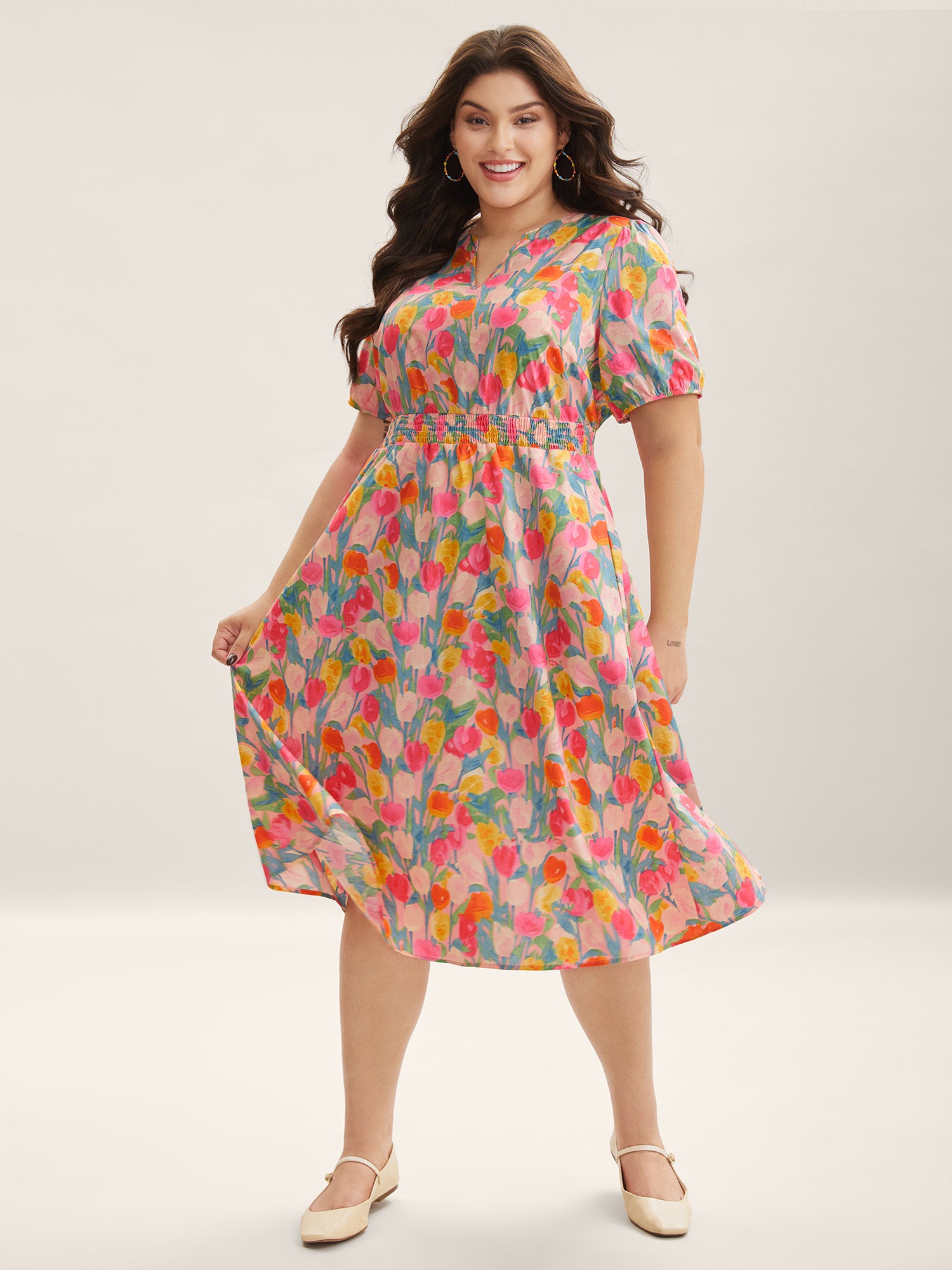 • Cotton Rosy Garden Shirred Waist Pockets Midi Dress