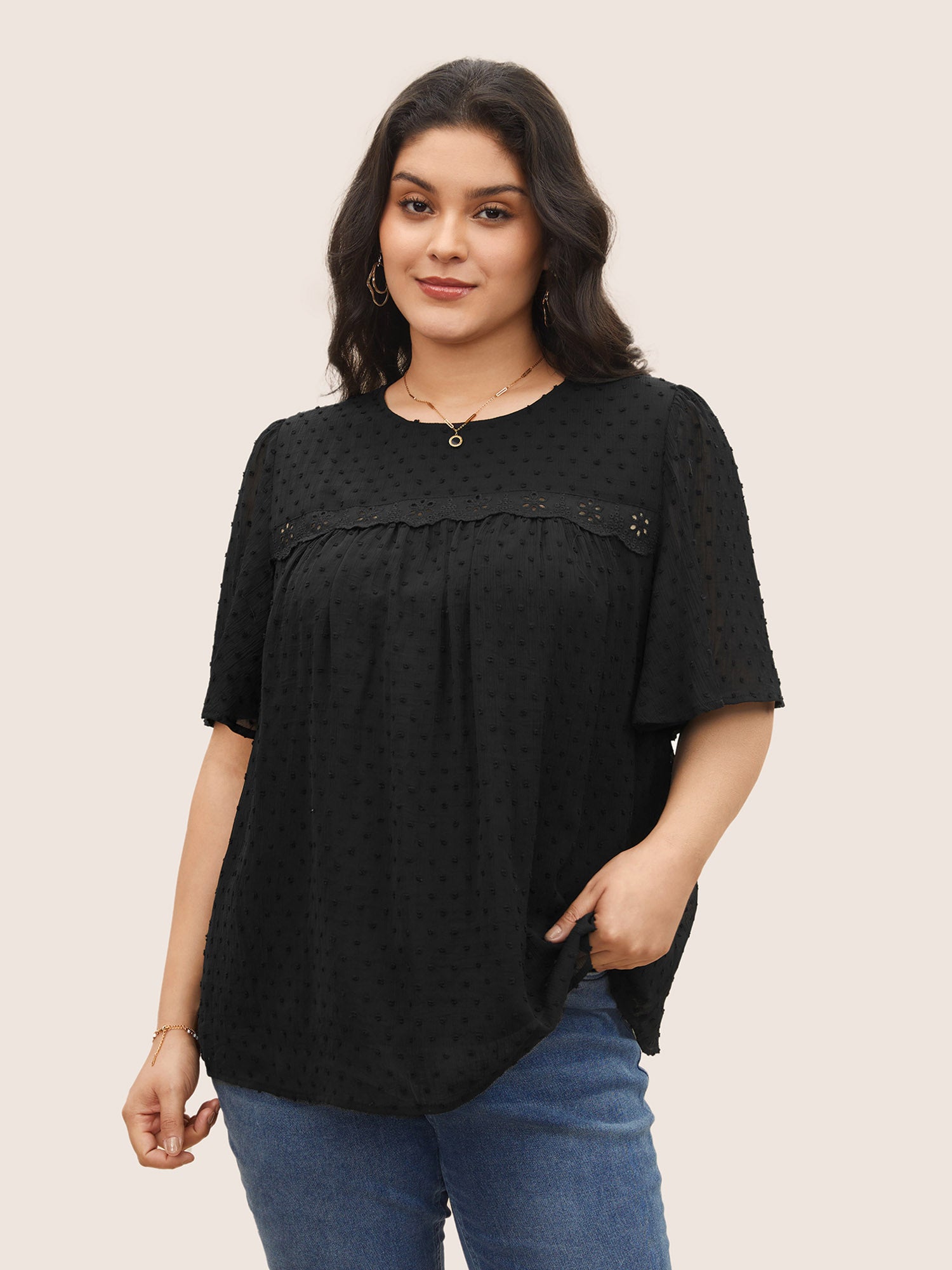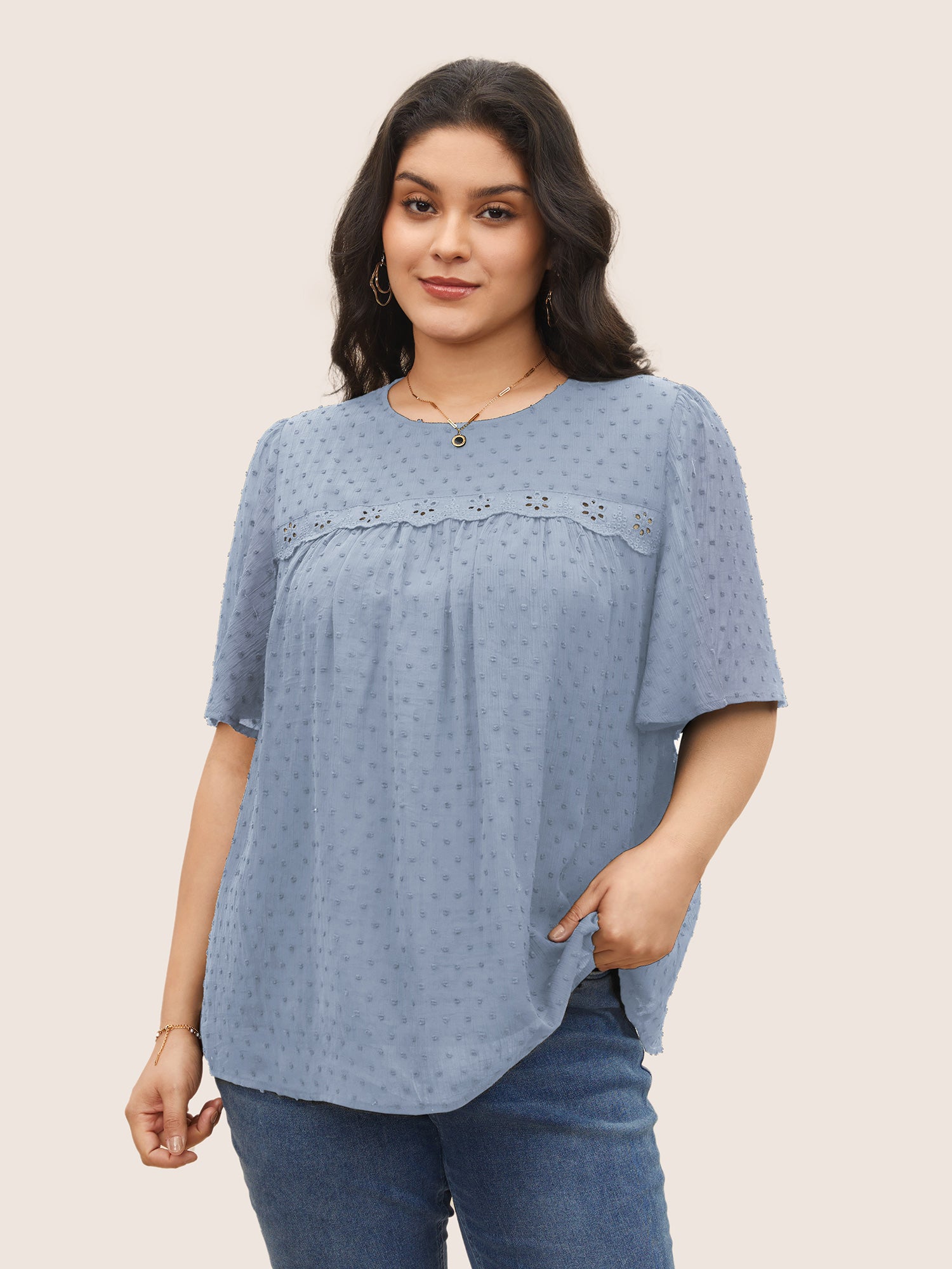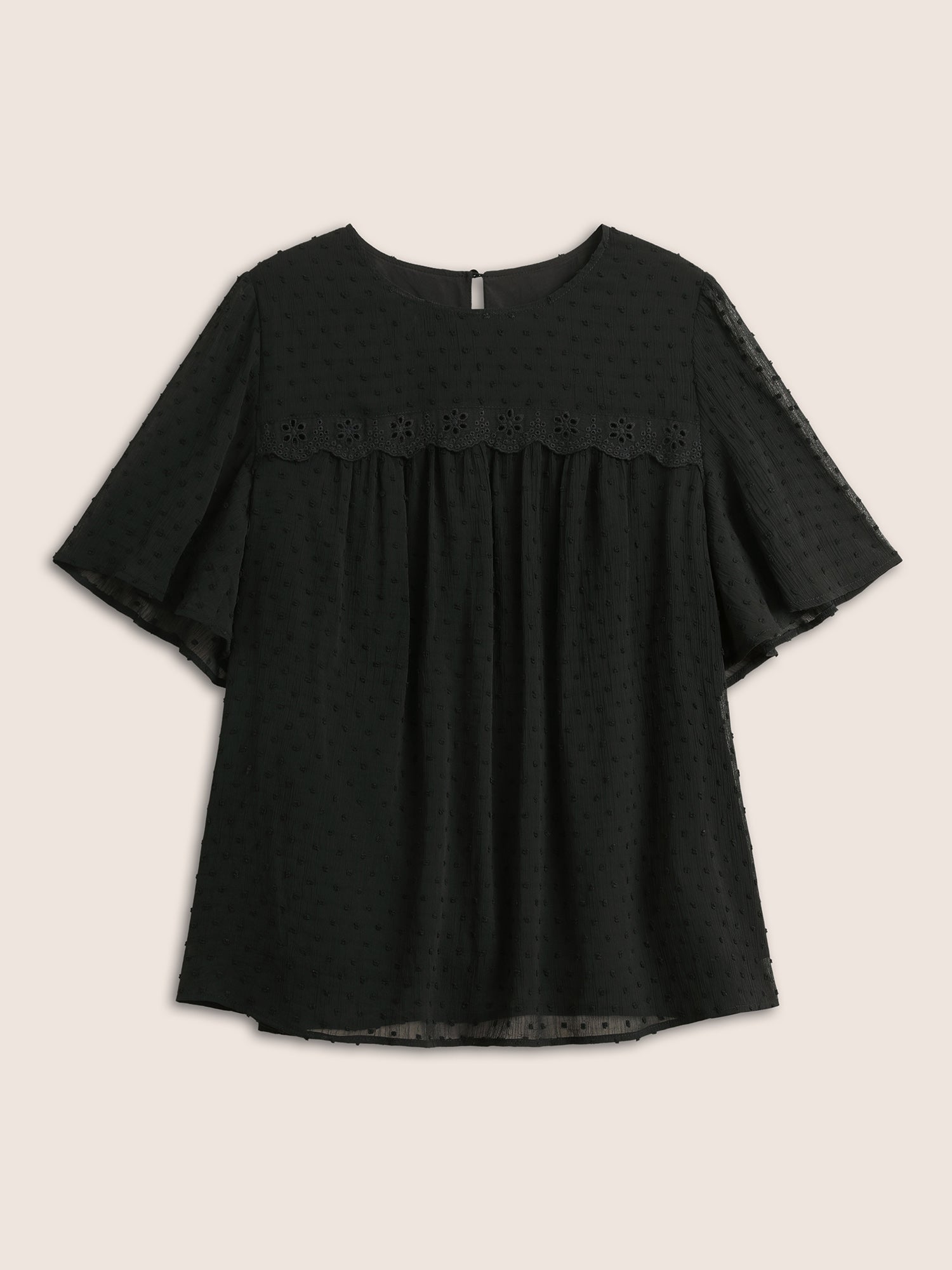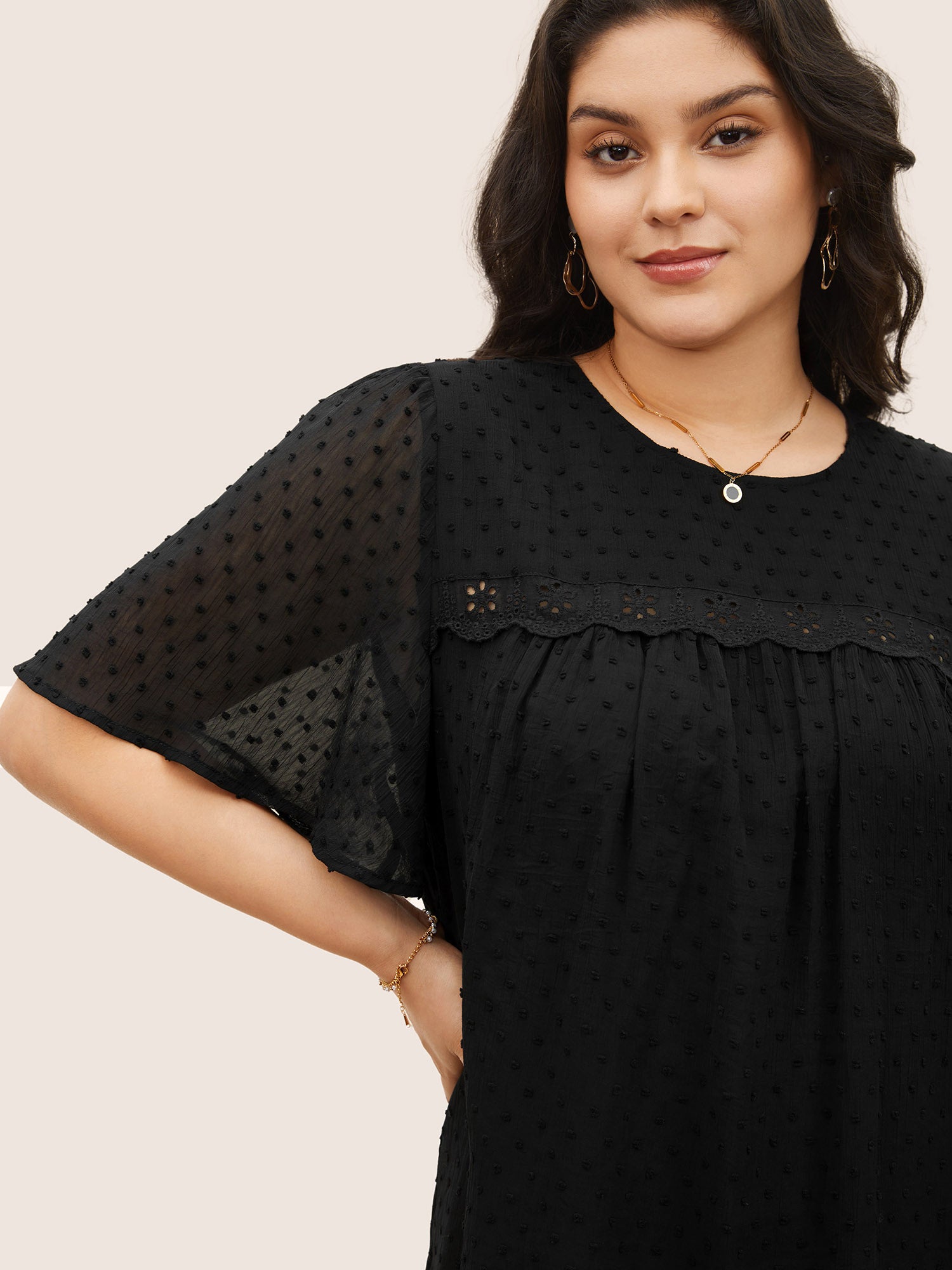 • Solid Texture Lace Trim See Through Gathered Blouse
