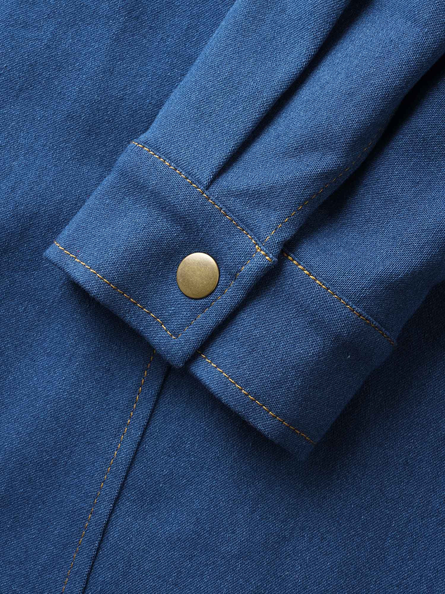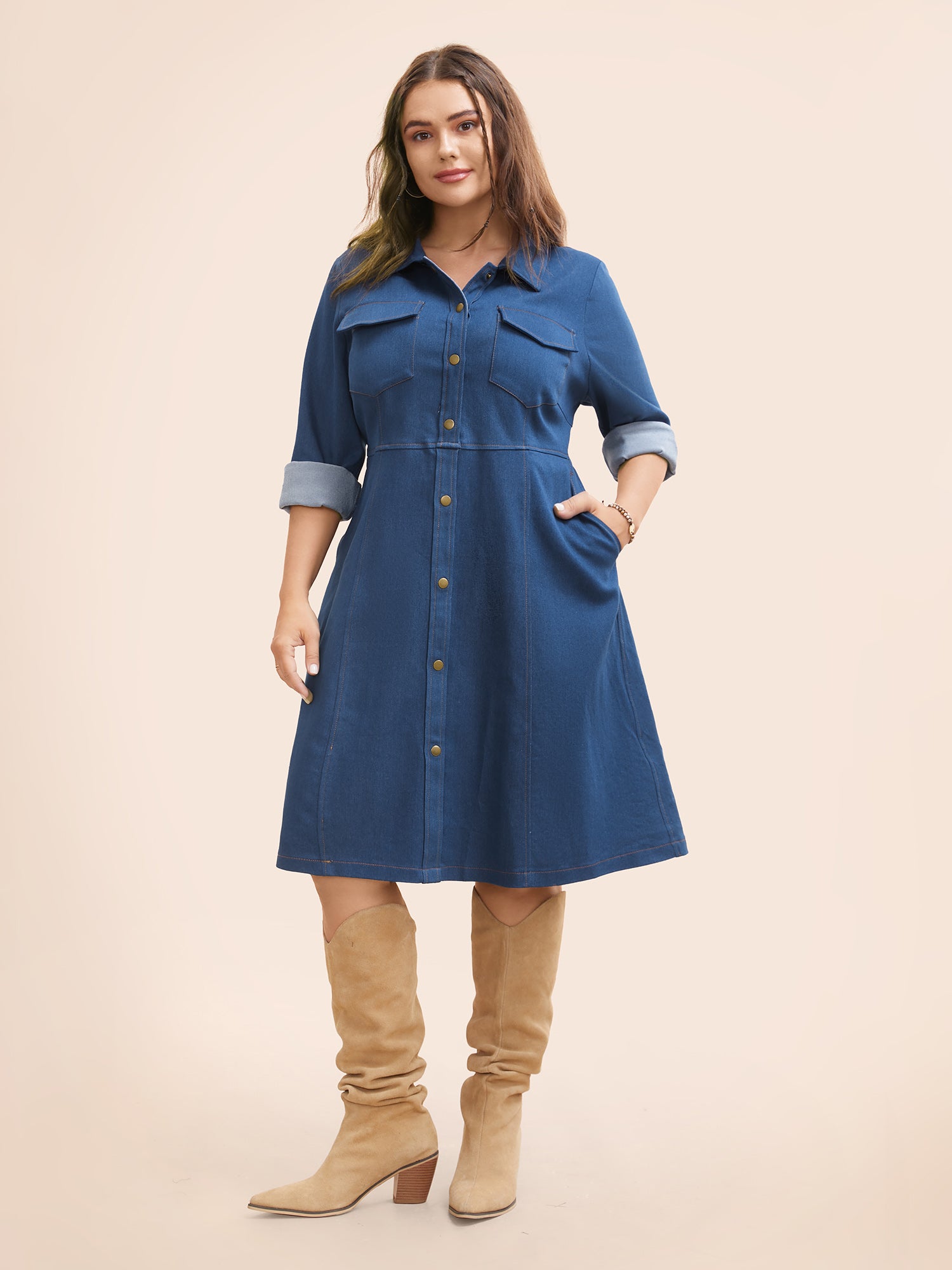Stretch Denim Chest Flaps Waist Defining Midi Dress