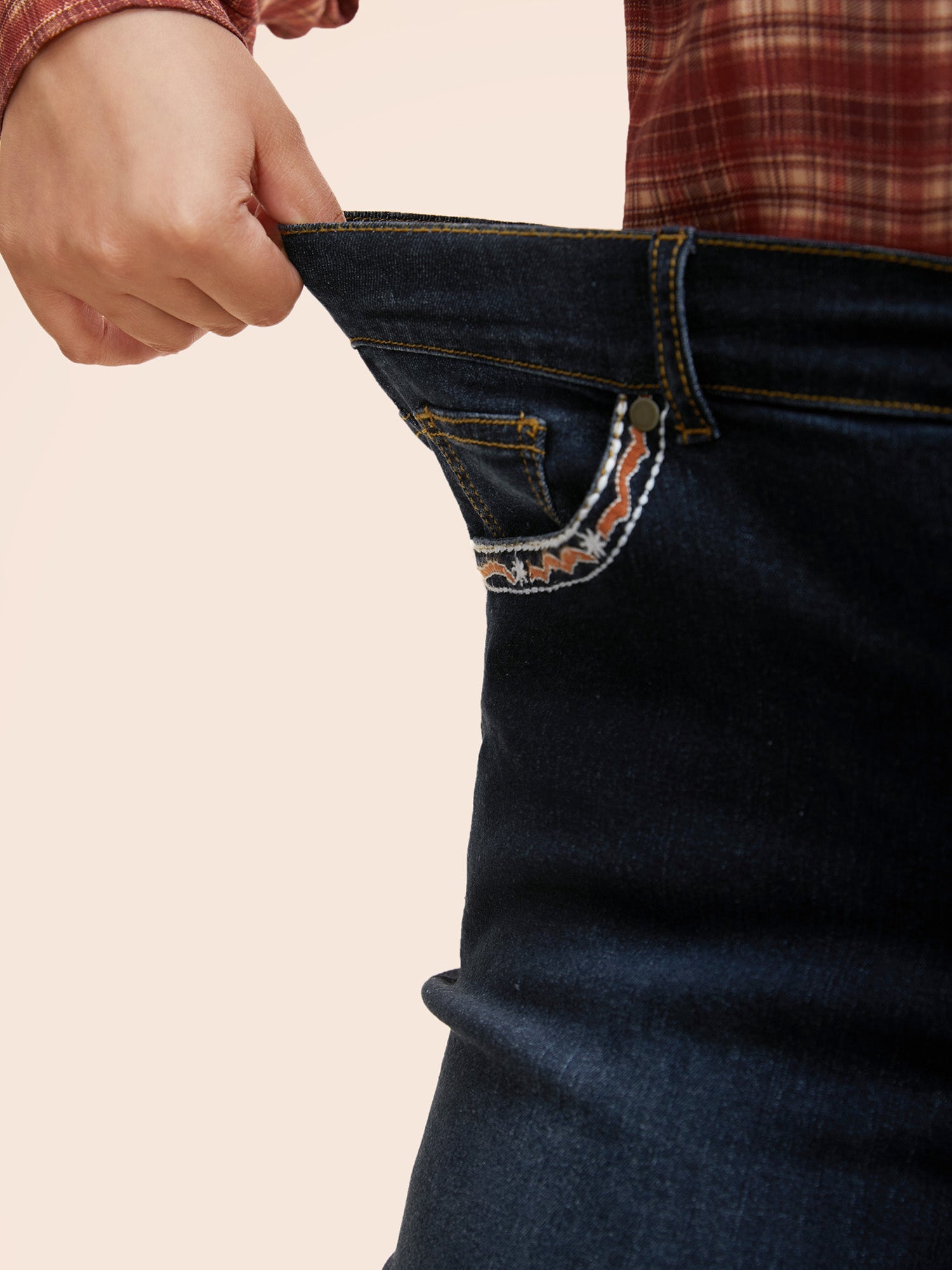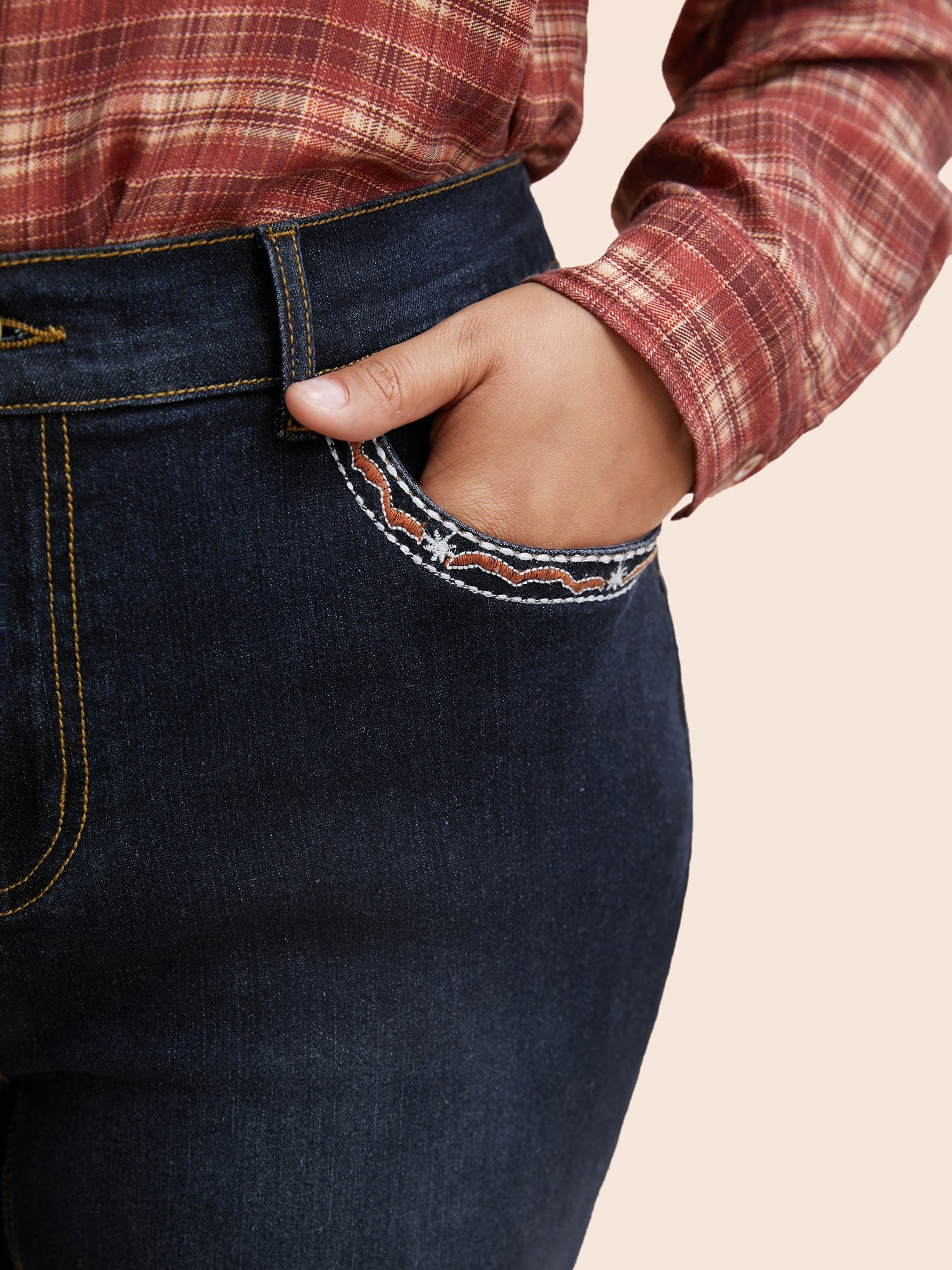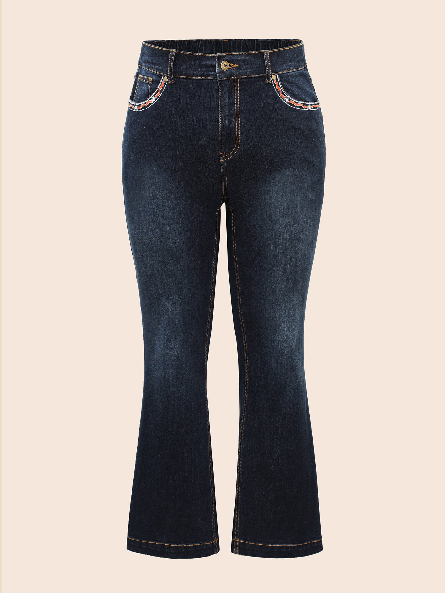 Stretch Denim Front Embroided Pockets Flare Jeans
