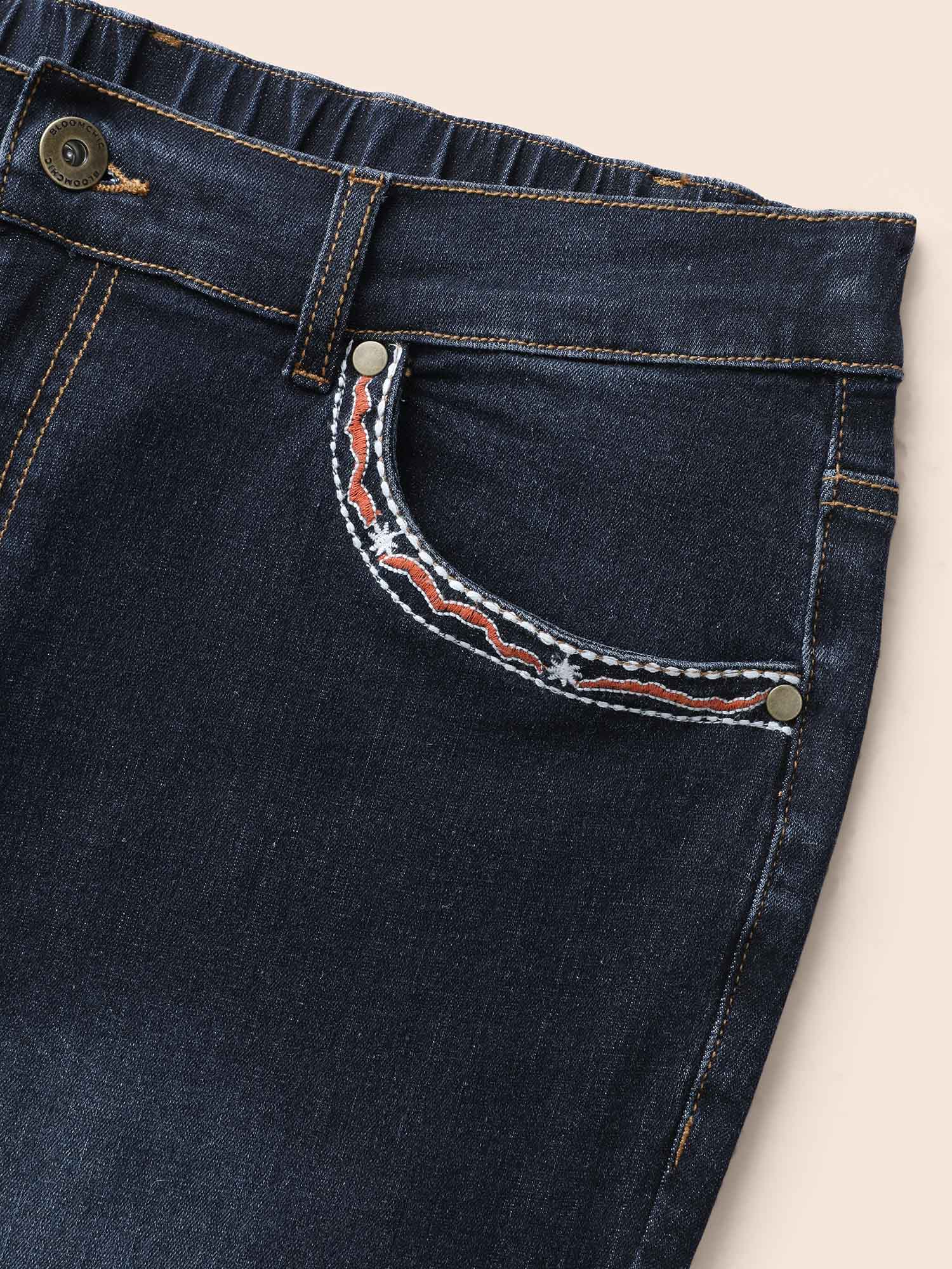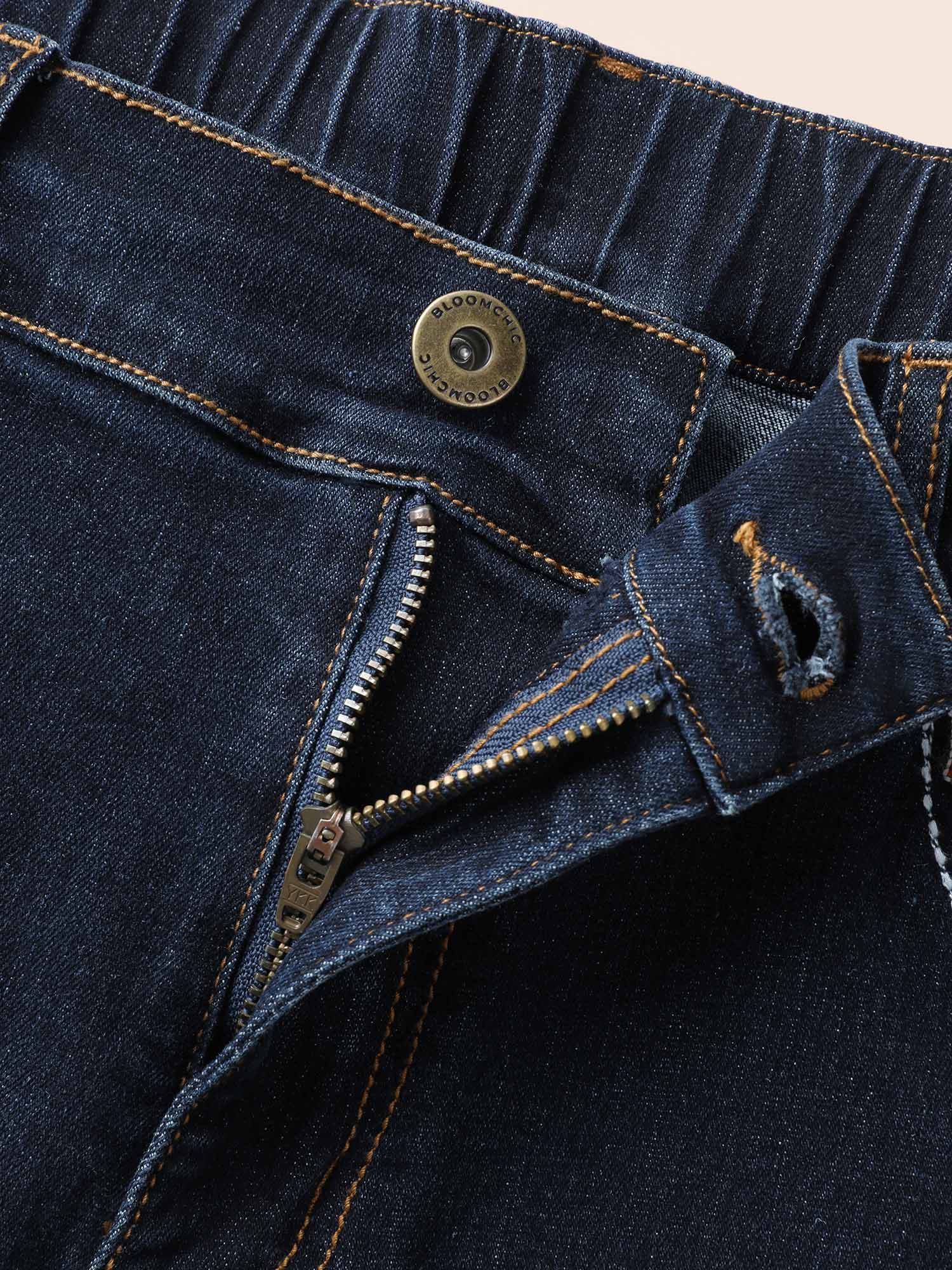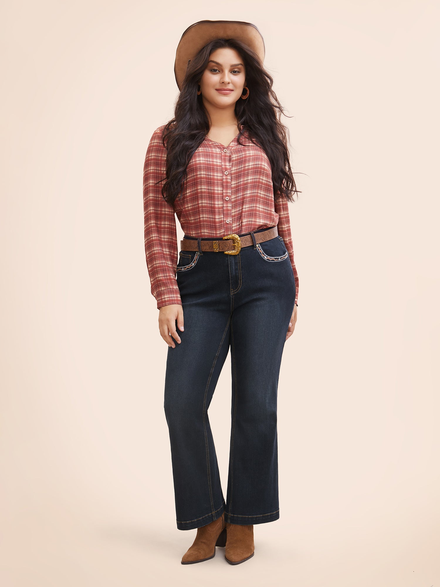 Stretch Denim Front Embroided Pockets Flare Jeans