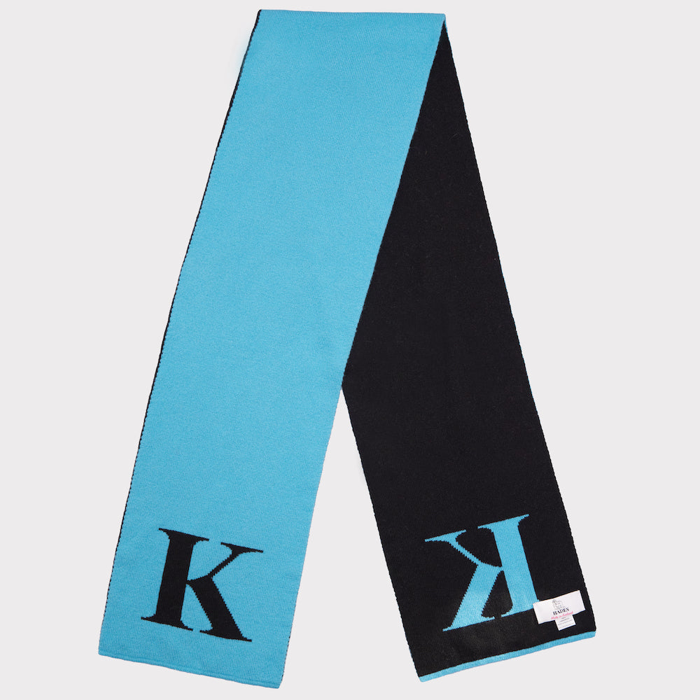 The turquoise and navy K macro double scarf from the Alphabet collection is made from pure lambswool.