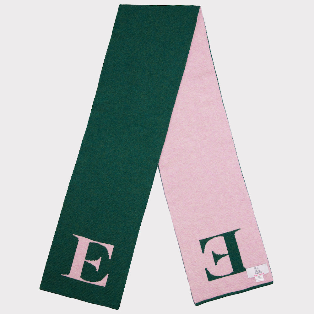 The forest green and pink E macro double scarf from the Alphabet collection is made from pure lambswool.
